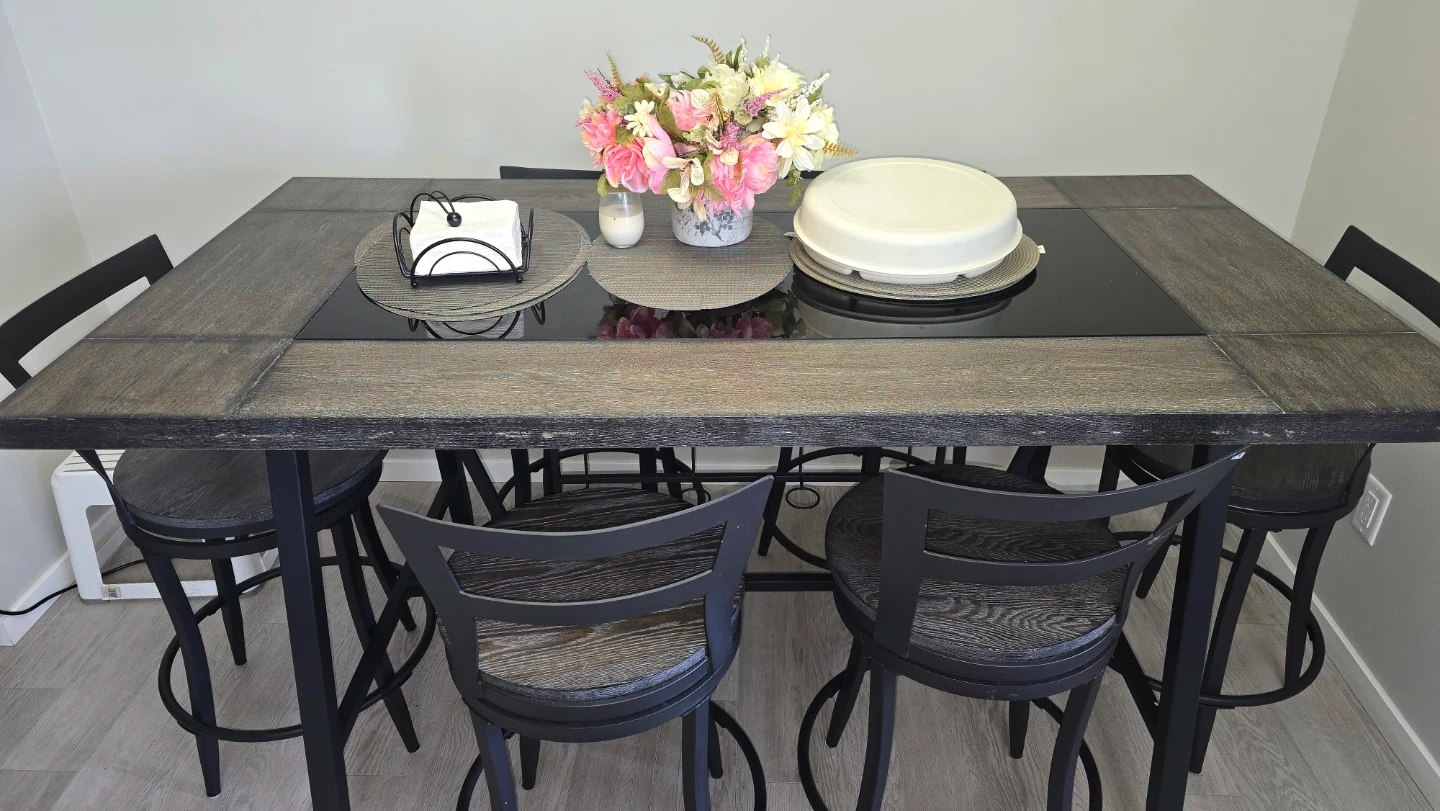 10Selling a dining table with six chairs! The table has a unique design with a dark wood finish and a black glass center. The chairs complement the table with their matching wood and black metal frames. It's a great set for family dinners or entertaining guests