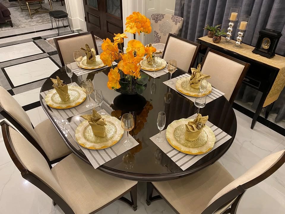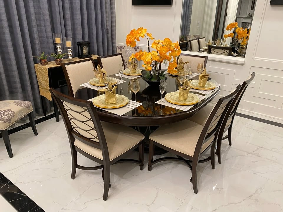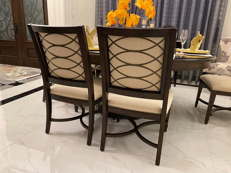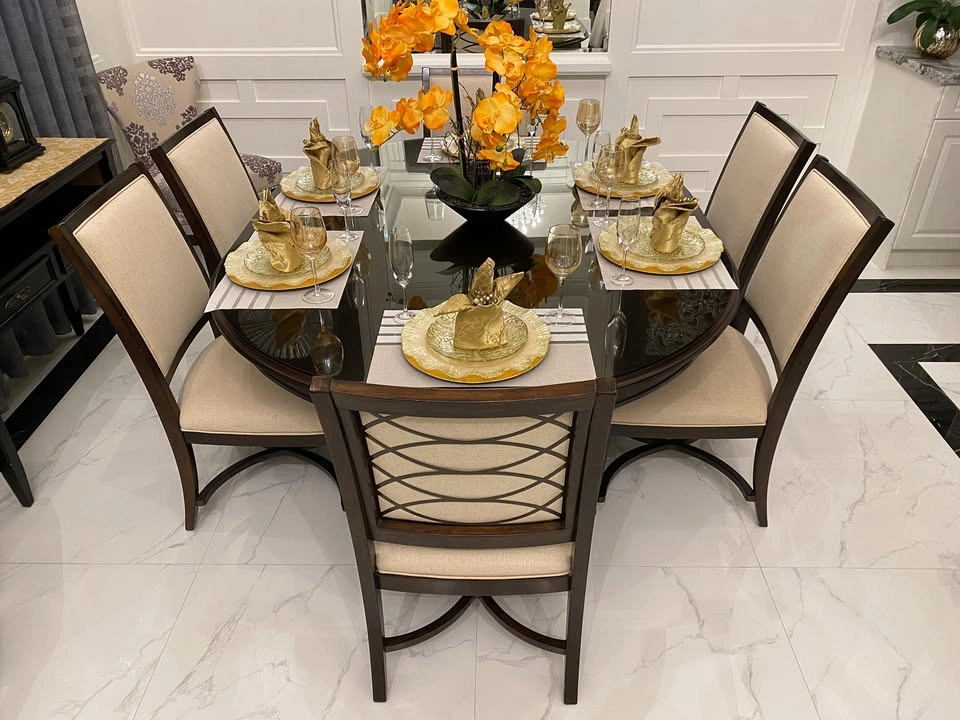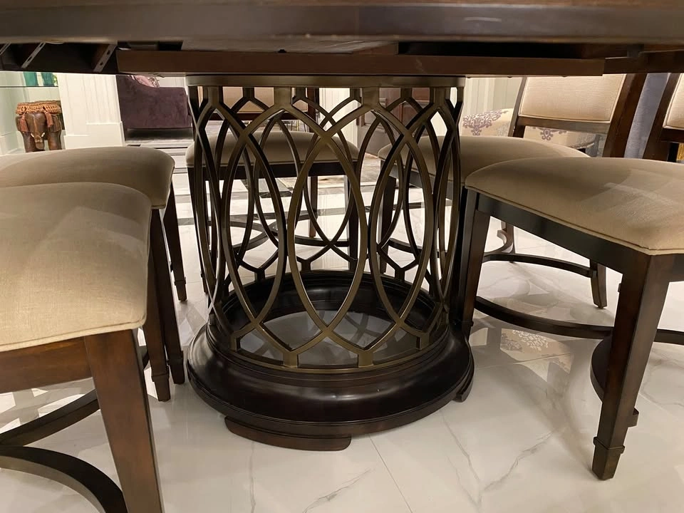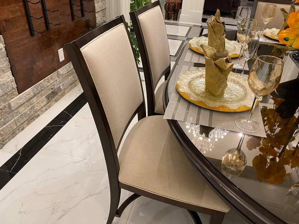 15Almost brand new, top quality dining table (wood) with 6 dining chairs (wood and fabric) dining set. The table (as seen in photo) has an extension leaf installed to accommodate 6 chairs. You can remove the extension to change the table to a round table for 4-6 people. Bonus: A custom made glass top worth $600 included to protect the table top from scratch. Non-smoking pet-free home. The sale includes table, table base, 6 chairs, glass top.
