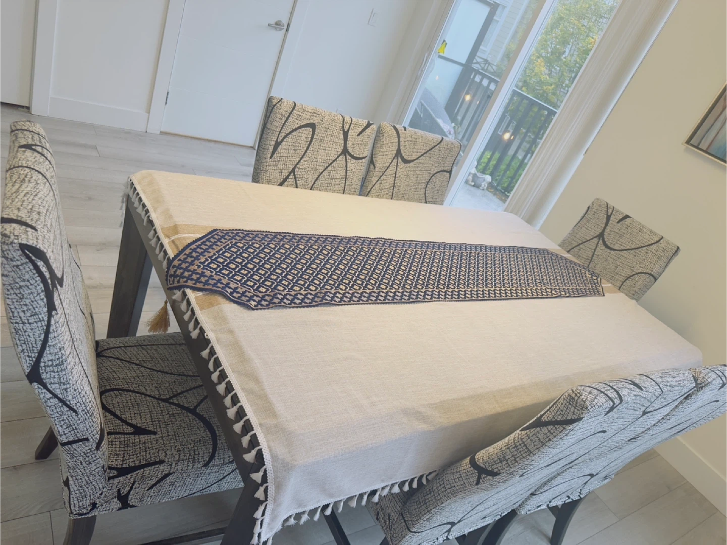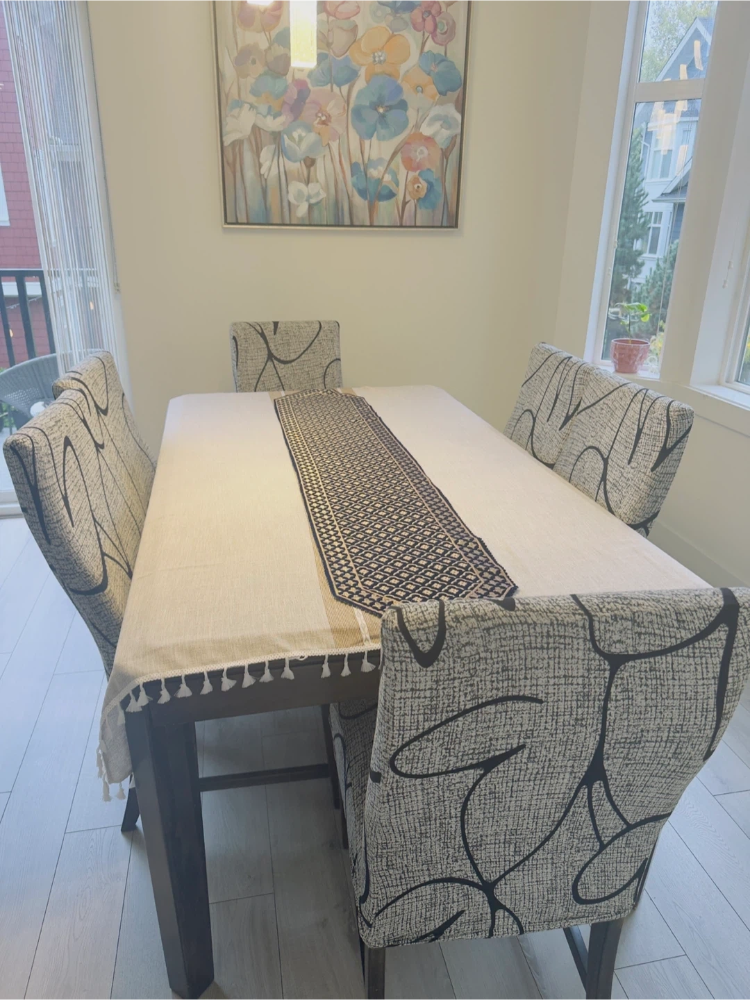 Selling a dining table with four chairs. The set features a neutral-toned table with a patterned runner and chairs upholstered in a complementary grey and white fabric. Perfect for a cozy dining space!