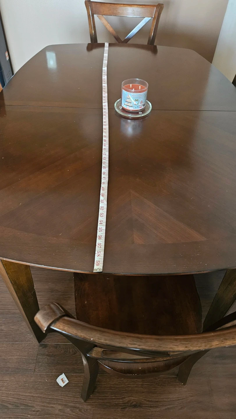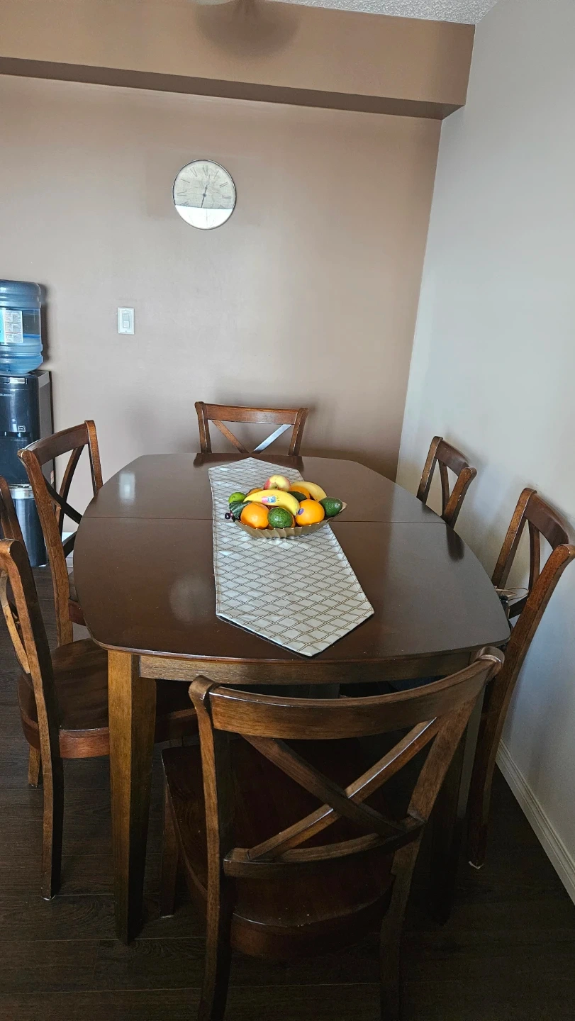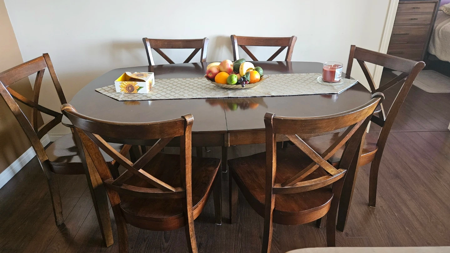 83Selling a dining extendable, good to sit 8 people with six chairs! It's a lovely set in great condition. The table is a dark wood colour and has a unique design. Perfect for family meals or gatherings with friends