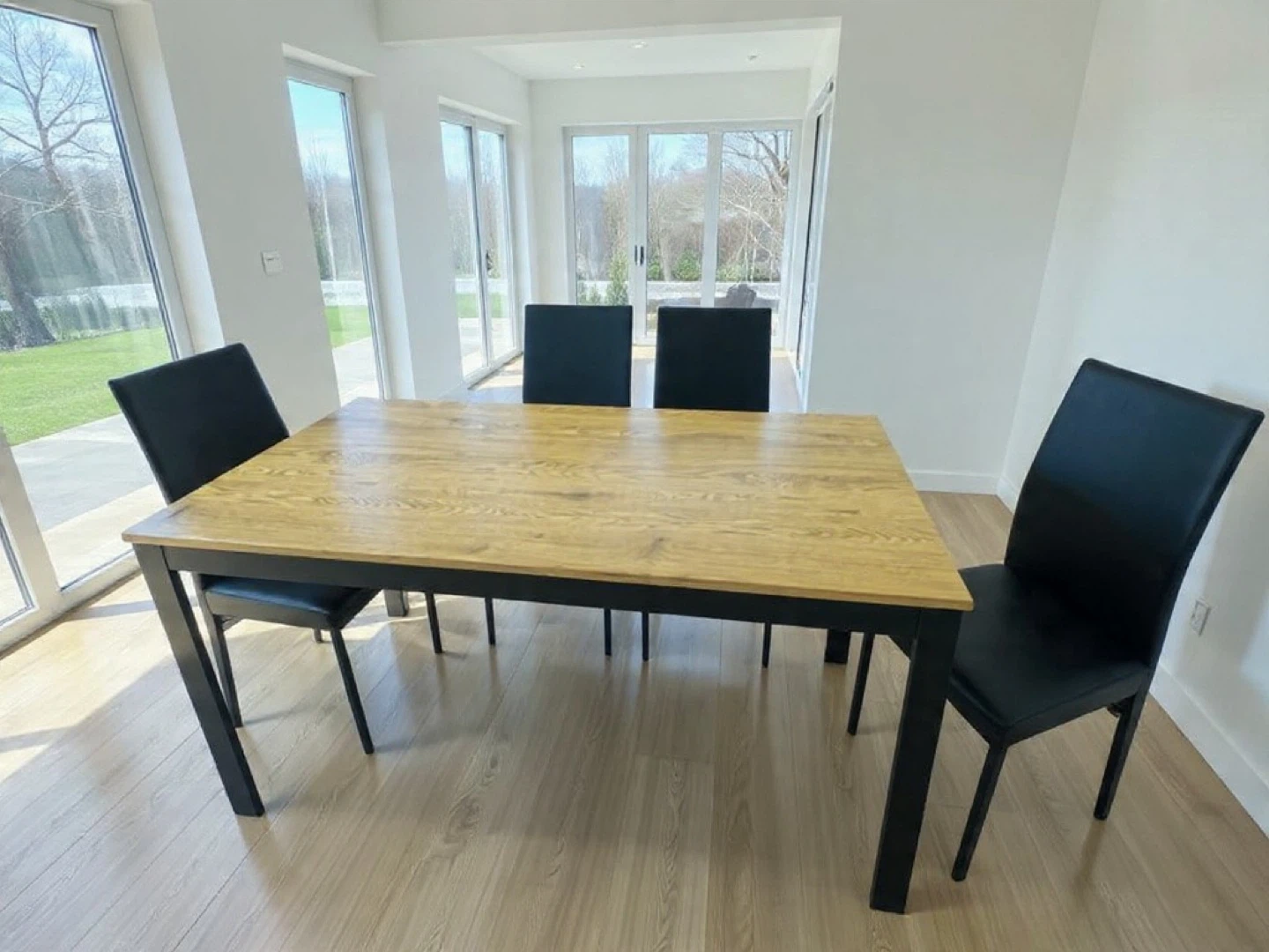 5Selling a dining table with six chairs. The table has a light wood top and black legs. The chairs are black with a sleek, modern design. Perfect for a kitchen or dining room!