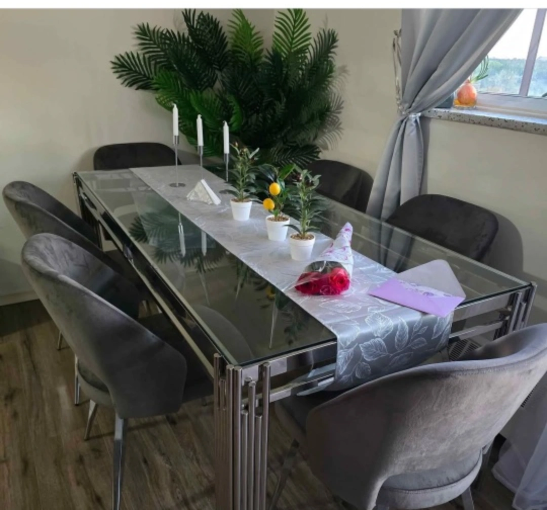 10Selling a dining table with six velvet chairs. The table has a glass top and a metal frame. The chairs are a dark grey colour and appear to be in good condition. Perfect for a dining room or kitchen!