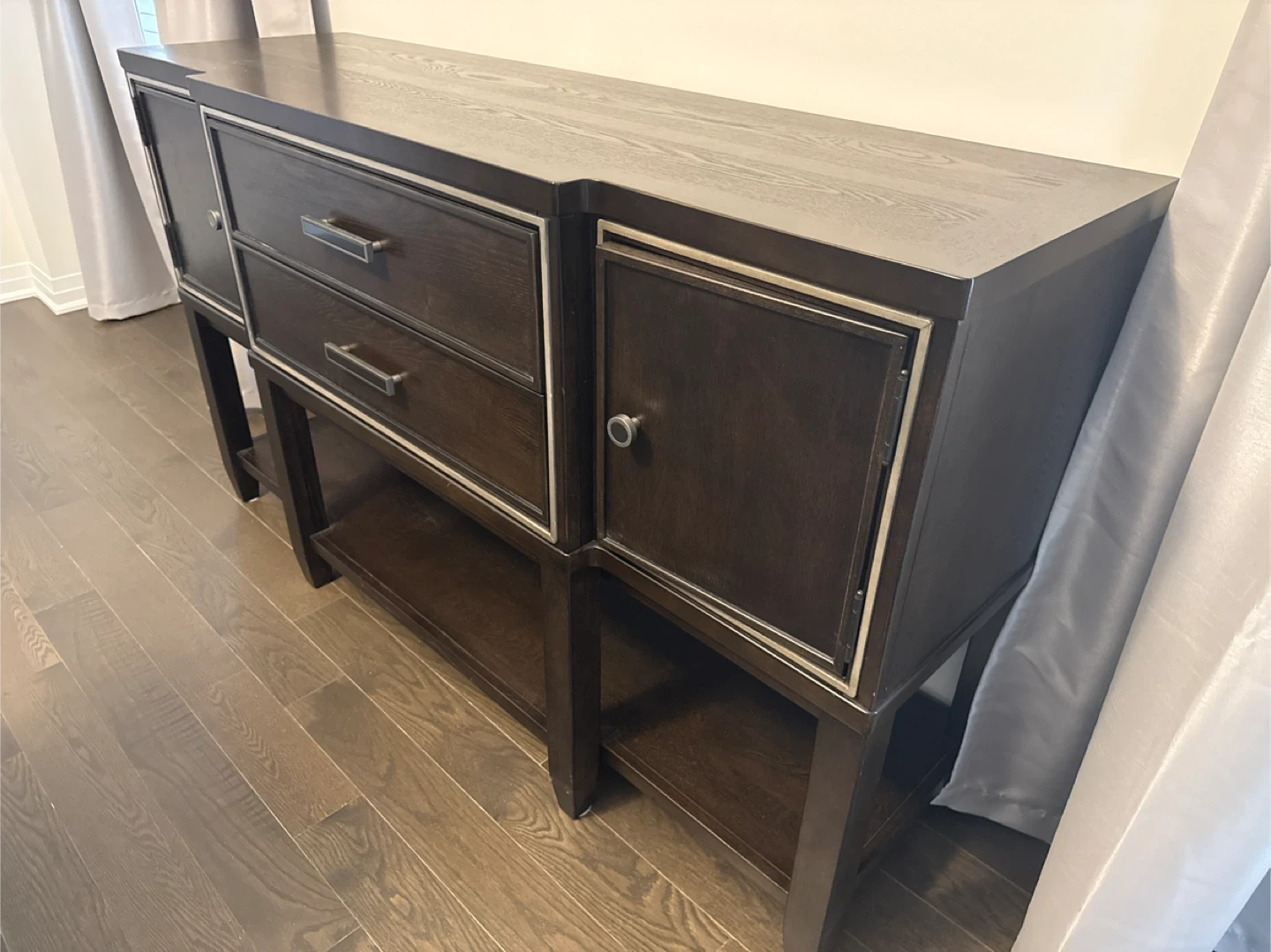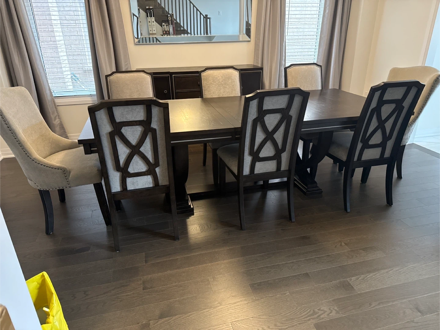 26Selling Ashley furniture dining table with eight chairs. The chairs are upholstered with a light grey fabric and have decorative nailhead trim. The table appears to be a dark wood finish. Perfect for a large family or hosting dinner parties!