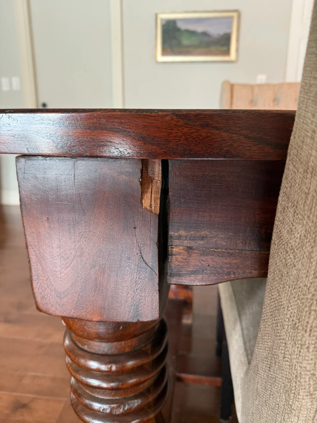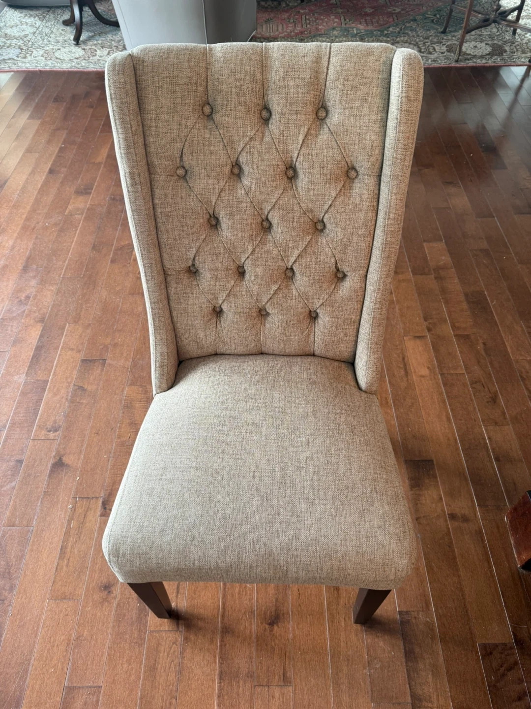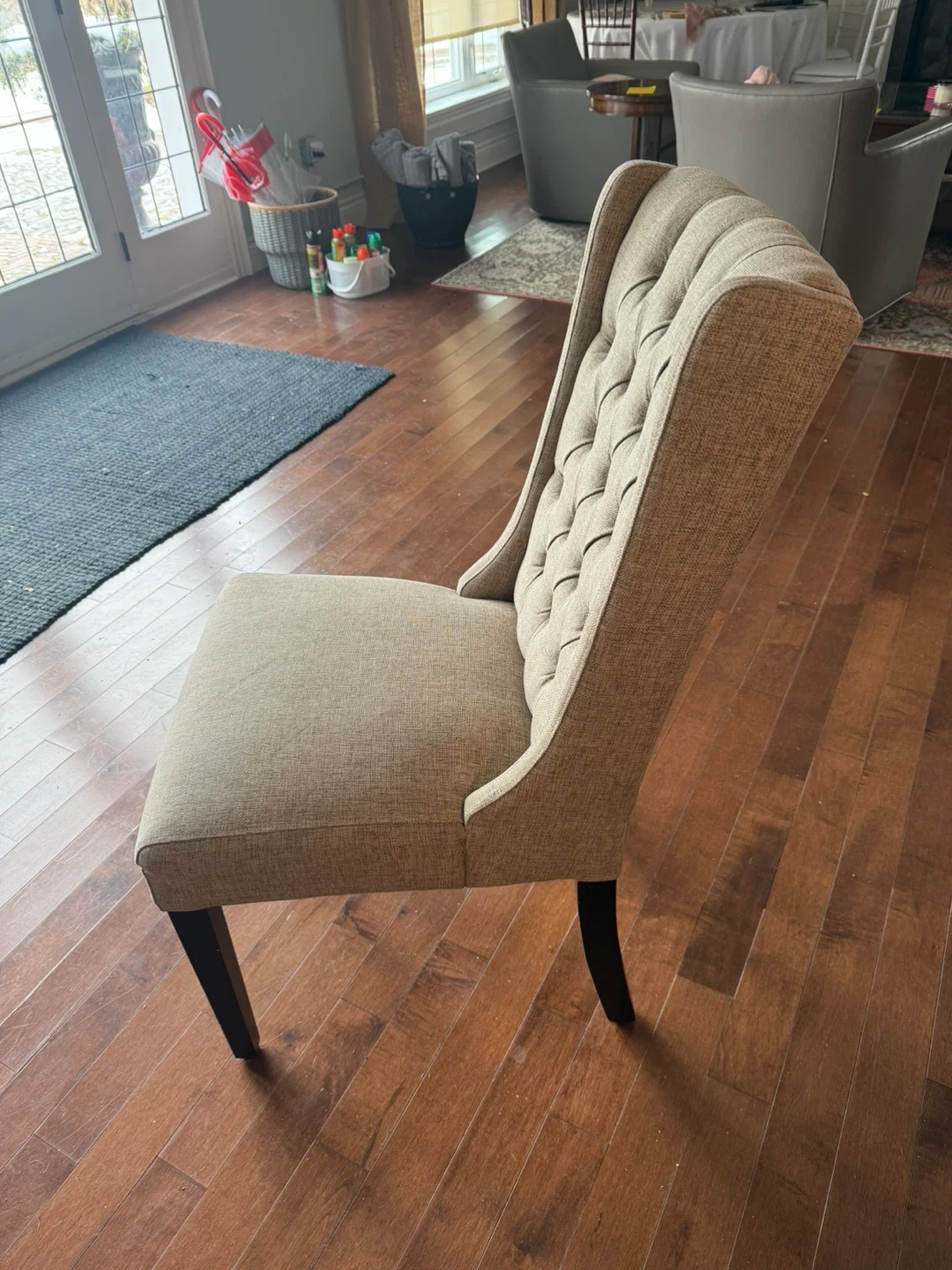 0Selling a dining table with 10 chairs. The table is a beautiful dark wood, and the chairs are upholstered with a neutral fabric and button detailing. Perfect for a large family or hosting dinner parties! The table is EXTREMELY heavy, so just be aware of that before coming to pick it up ๐ one little chip in the wood on the corner or the table, but otherwise in great condition! Table is also extendable and comes with to leaves.