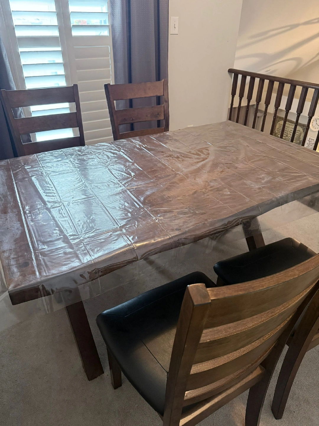 31Selling a dining table with chairs. The chairs have black leather seats and a wooden frame. The table is covered with a clear plastic protector. Great for any dining room! less than year of barely using. Comes with 6 black leather wooden frame chairs.