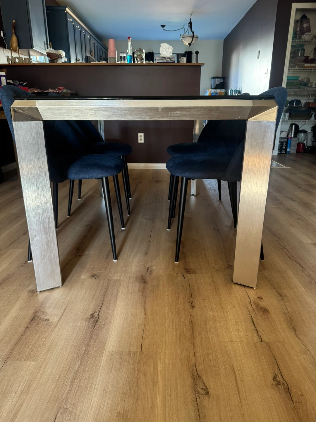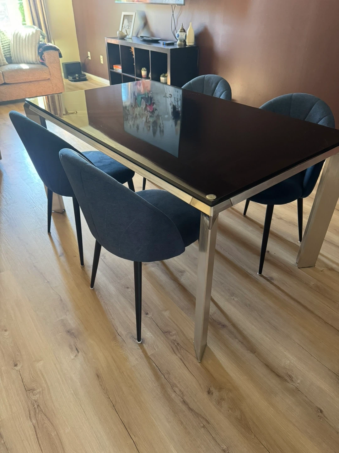 10Tempered glass dining table with 4 chairs. The chairs are only a couple months old but have been used a handful of times. We bought a new table and chairs and need this taken. It is roughly 58” long by 35” wide and 30” tall.