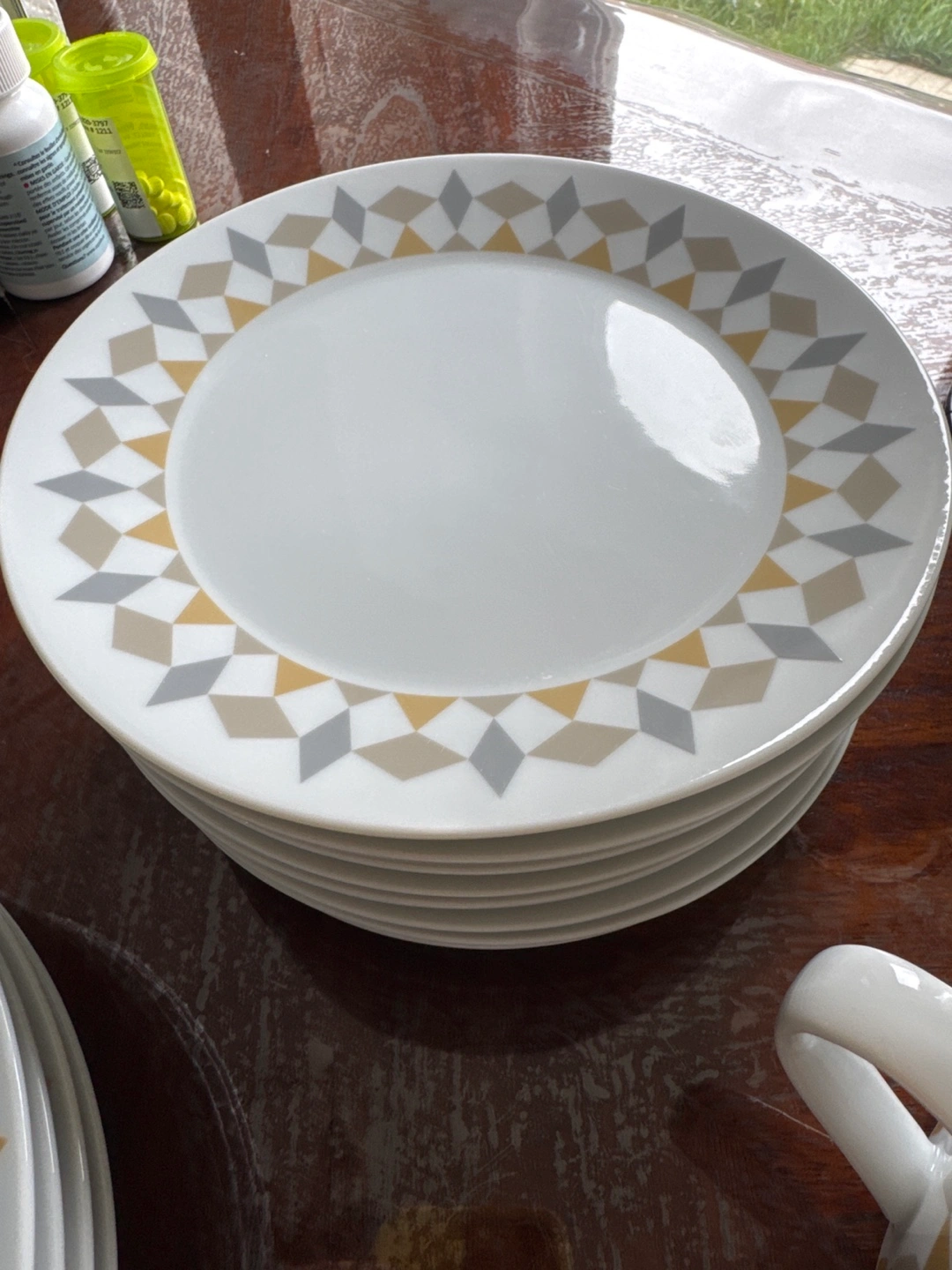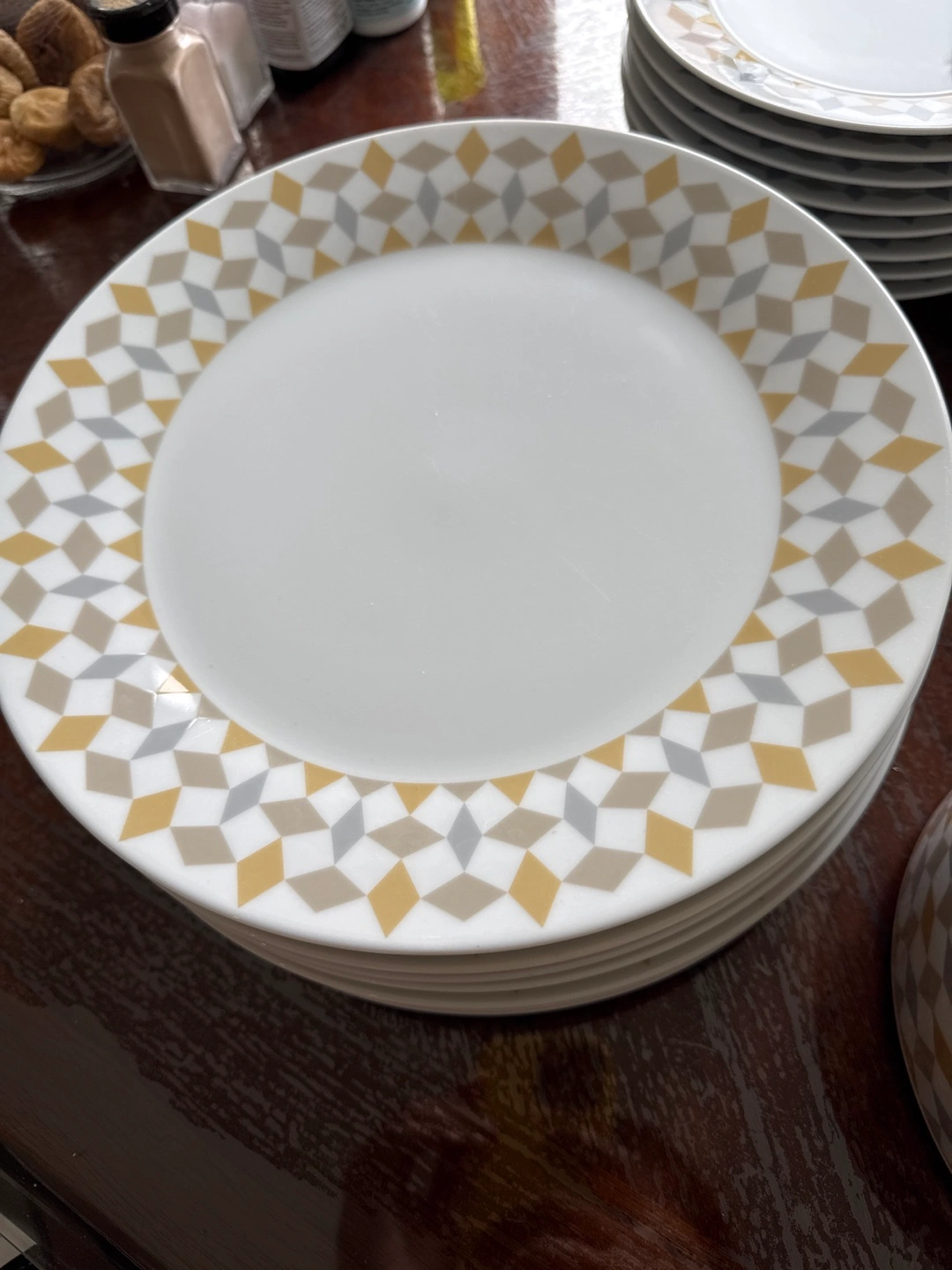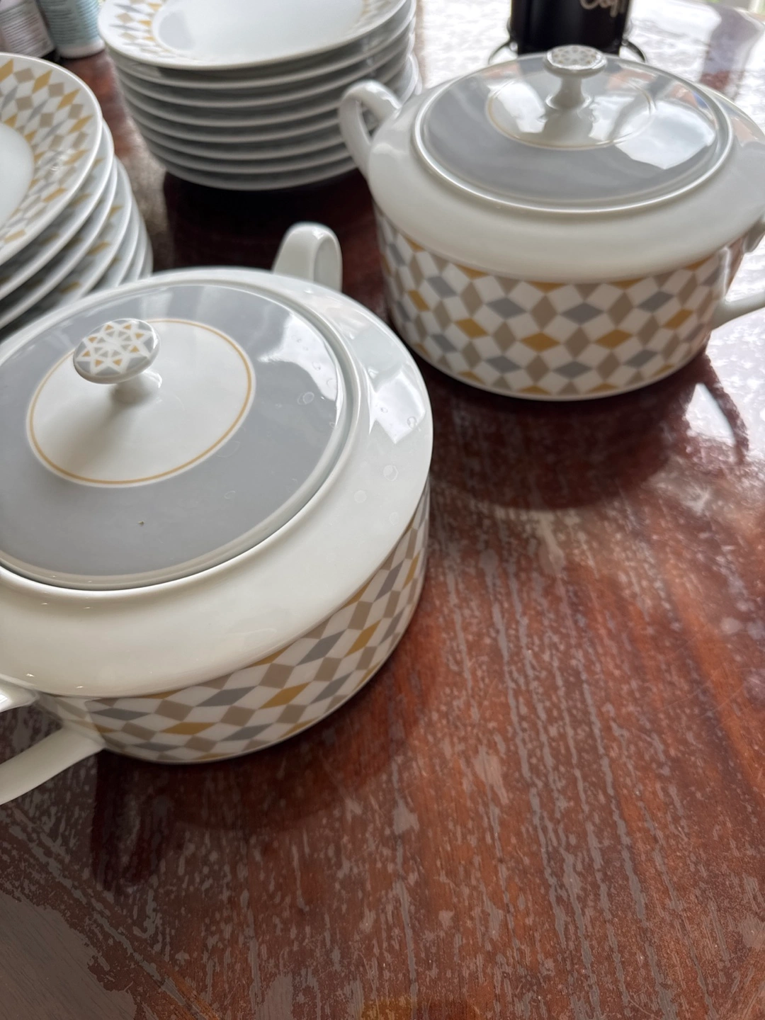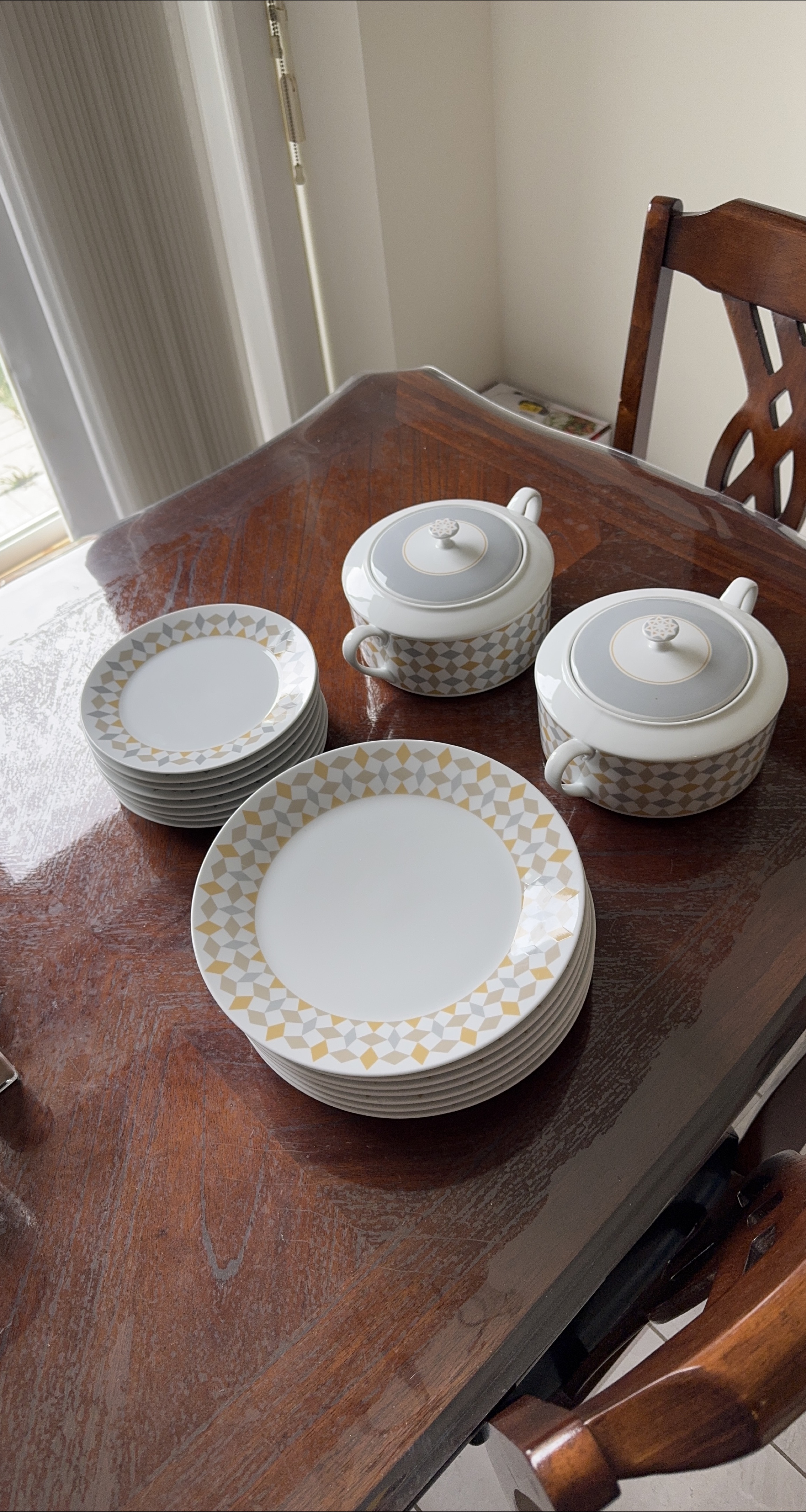 Selling a set of dinner plates and serving bowls, perfect for everyday use or special occasions! They feature a stylish geometric pattern in neutral tones. The set is in great condition and ready to add a touch of elegance to your dining table. Please note that there are 8 quarter plates and 7 dinner plates.