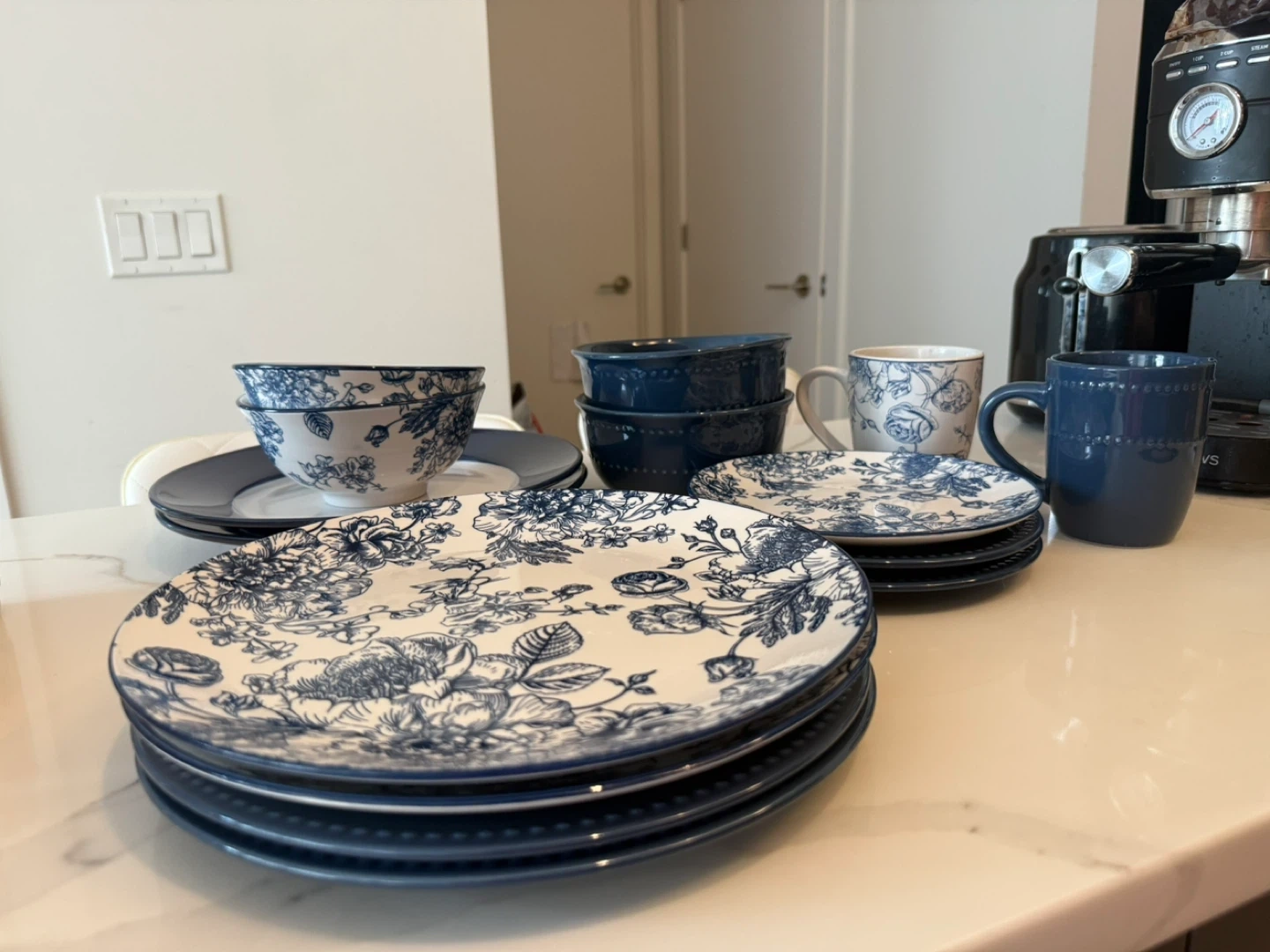 60Selling a 16 pieces set of dinnerware, featuring a mix of floral and solid blue pieces. Includes 6 big plates, 4small plates , 4 bowls, and 2mugs to complete your dining setup. Perfect for adding a touch of elegance to your table! (There are some scratches, but they don’t have lip filler or breakage)
