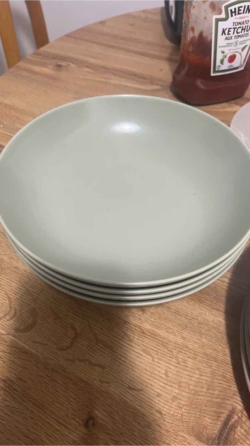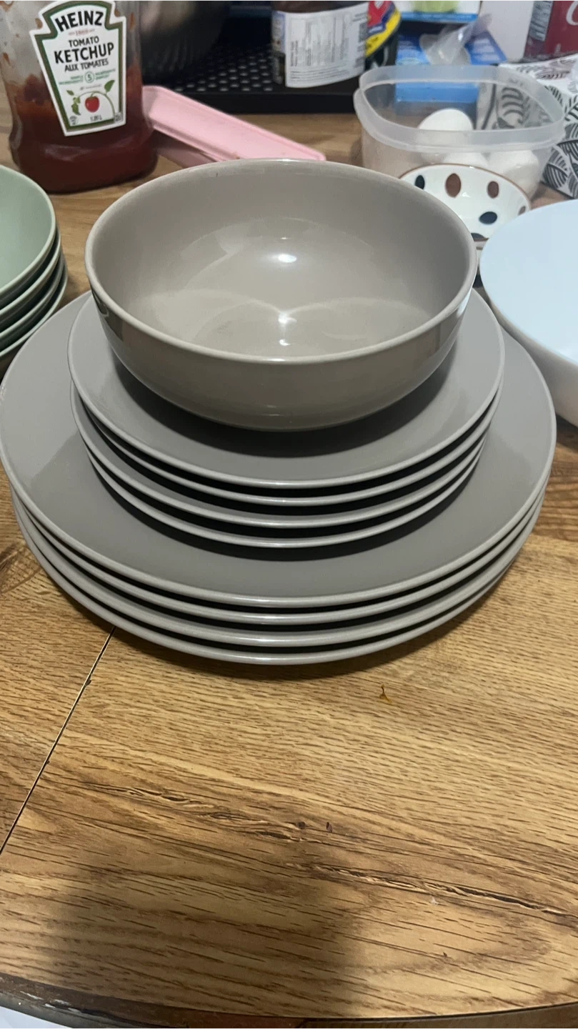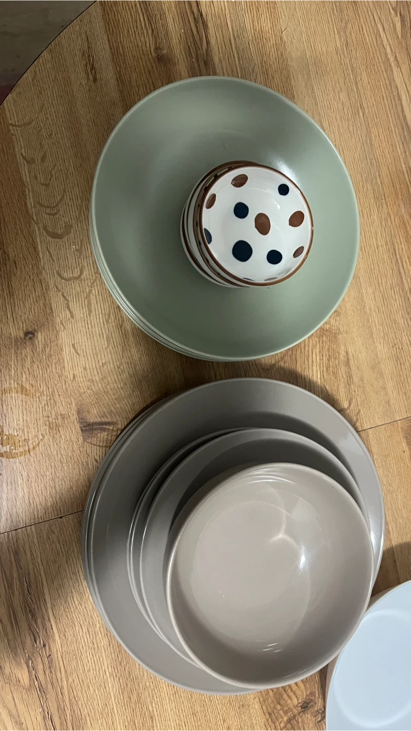 28Selling a dinnerware set that includes plates and bowls. The set features a mix of grey and light green pieces, perfect for adding a touch of colour to your table setting. Great for everyday use or special occasions!