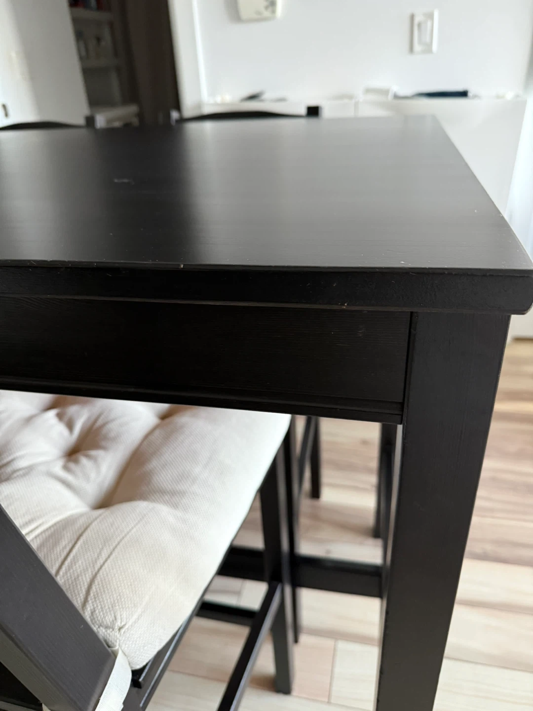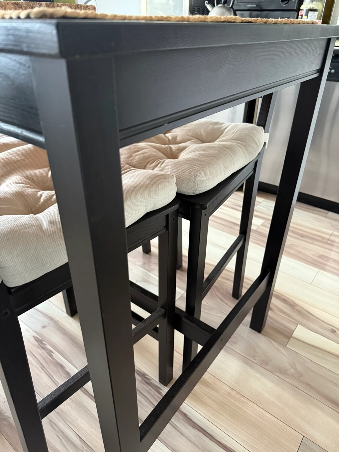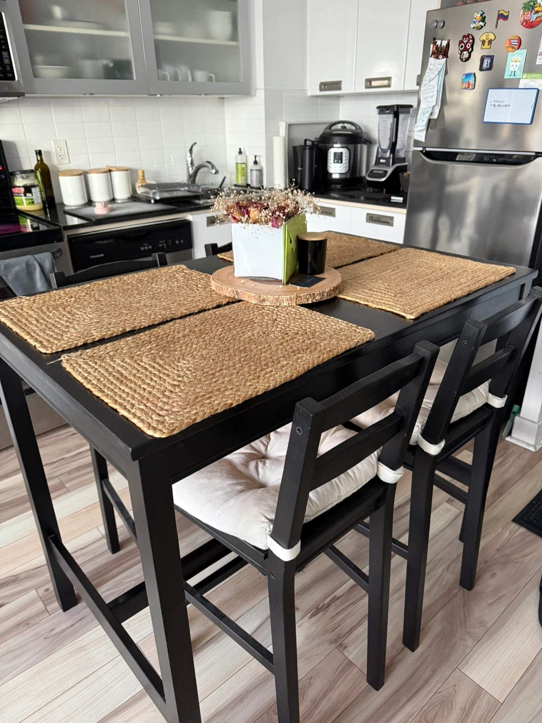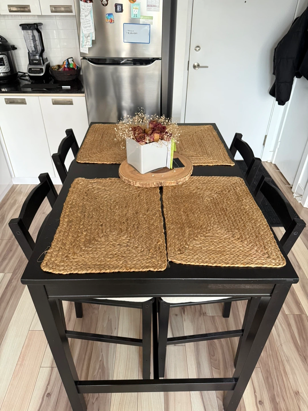 23Selling a pub-style dining table with four chairs! It's in great shape and perfect for a smaller space. The chairs have comfy cushions, and the table comes with four placemats to match. Center wood tray piece included too. Dimensions: Table length: 118 cm (46 1/2 ") Table width: 74 cm (29 1/8 ") Table height: 95 cm (37 3/8 ") Seat width: 40 cm (15 3/4 ") Seat depth: 41 cm (16 1/8 ") Seat height: 63 cm (24 3/4 ") Open to negotiate IKEA link https://www.ikea.com/ca/en/p/haegernaes-bar-table-and-4-bar-stools-black-stained-pine-80606585/#content