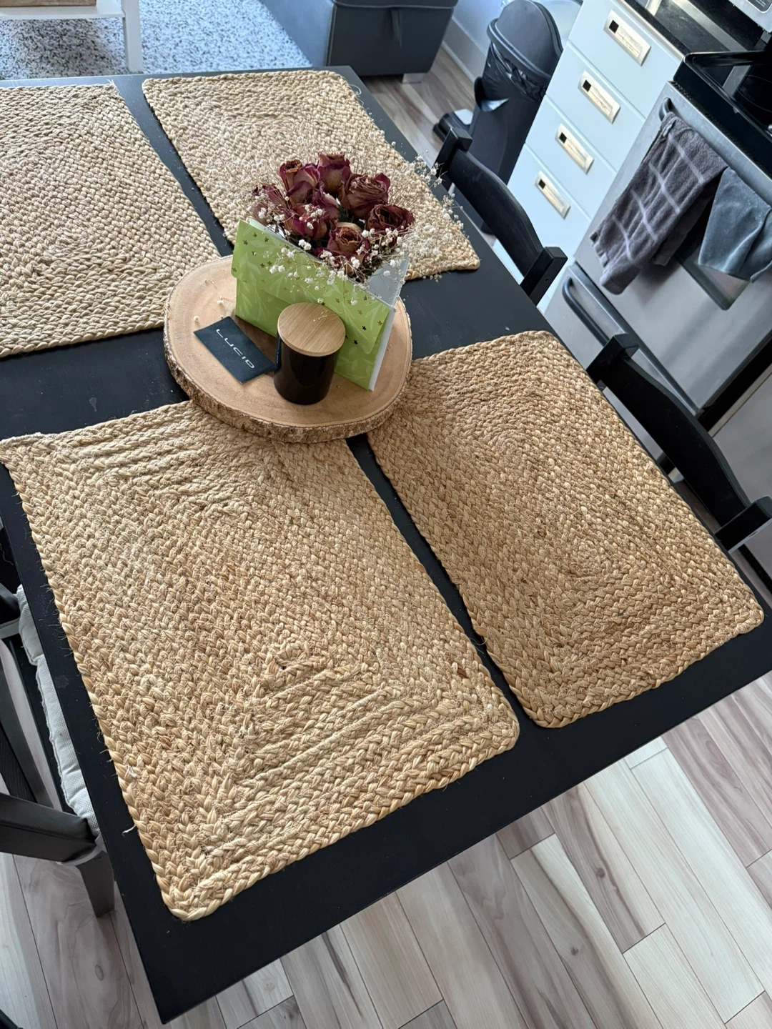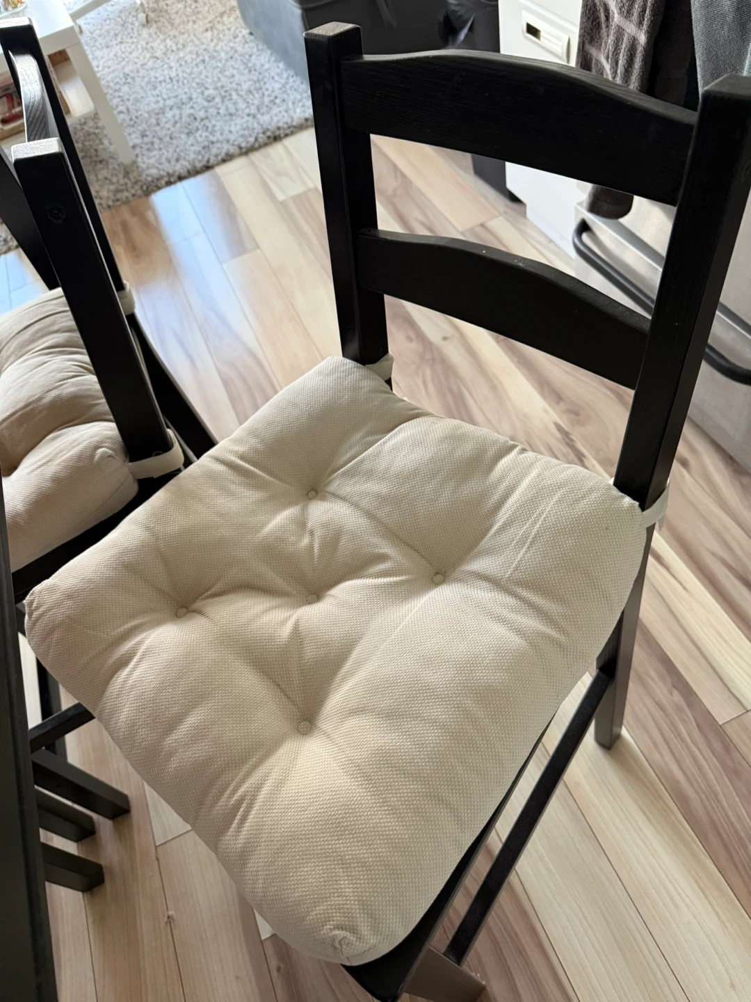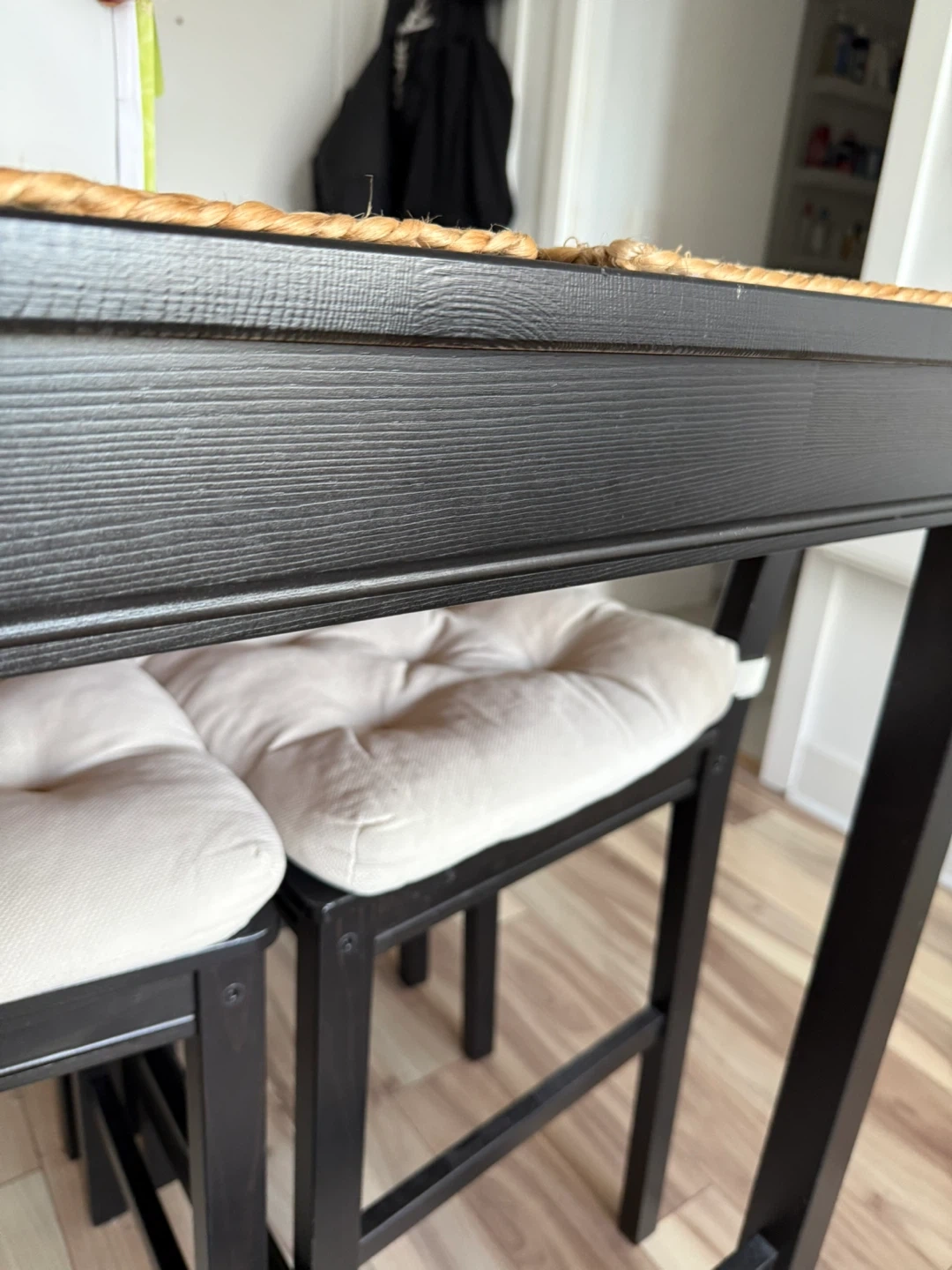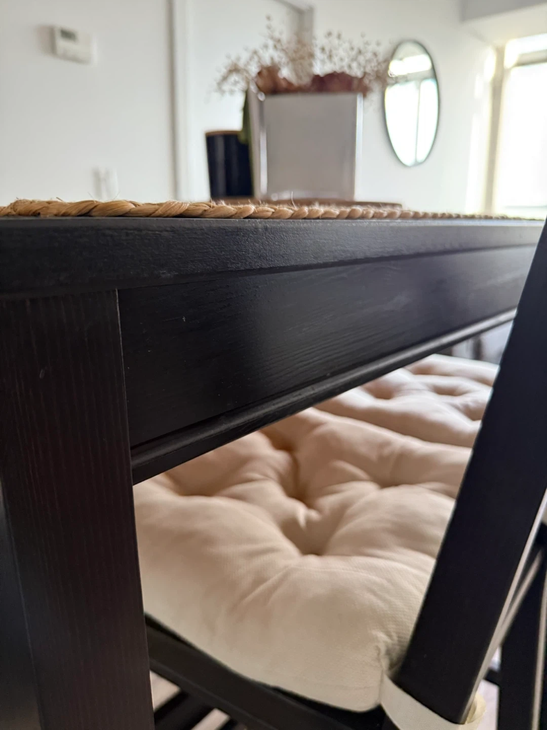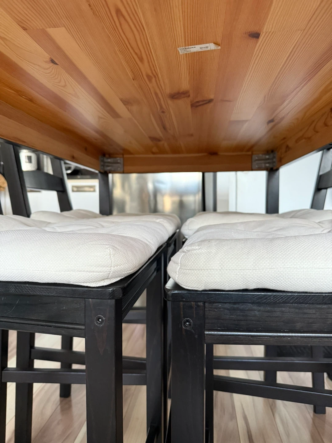23Selling a pub-style dining table with four chairs! It's in great shape and perfect for a smaller space. The chairs have comfy cushions, and the table comes with four placemats to match. Center wood tray piece included too. Dimensions: Table length: 118 cm (46 1/2 ") Table width: 74 cm (29 1/8 ") Table height: 95 cm (37 3/8 ") Seat width: 40 cm (15 3/4 ") Seat depth: 41 cm (16 1/8 ") Seat height: 63 cm (24 3/4 ") Open to negotiate IKEA link https://www.ikea.com/ca/en/p/haegernaes-bar-table-and-4-bar-stools-black-stained-pine-80606585/#content