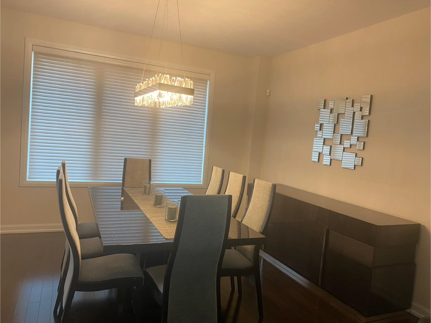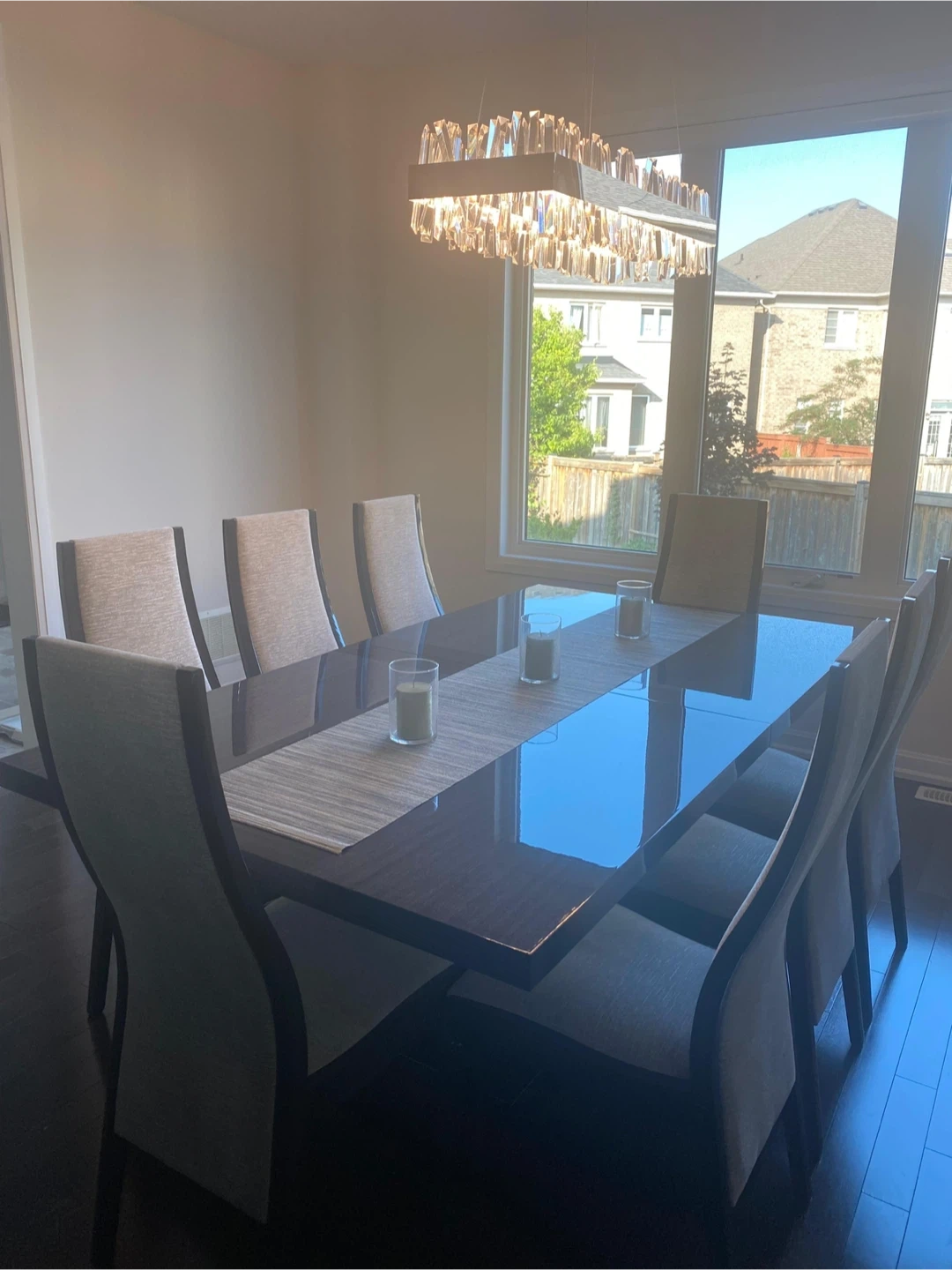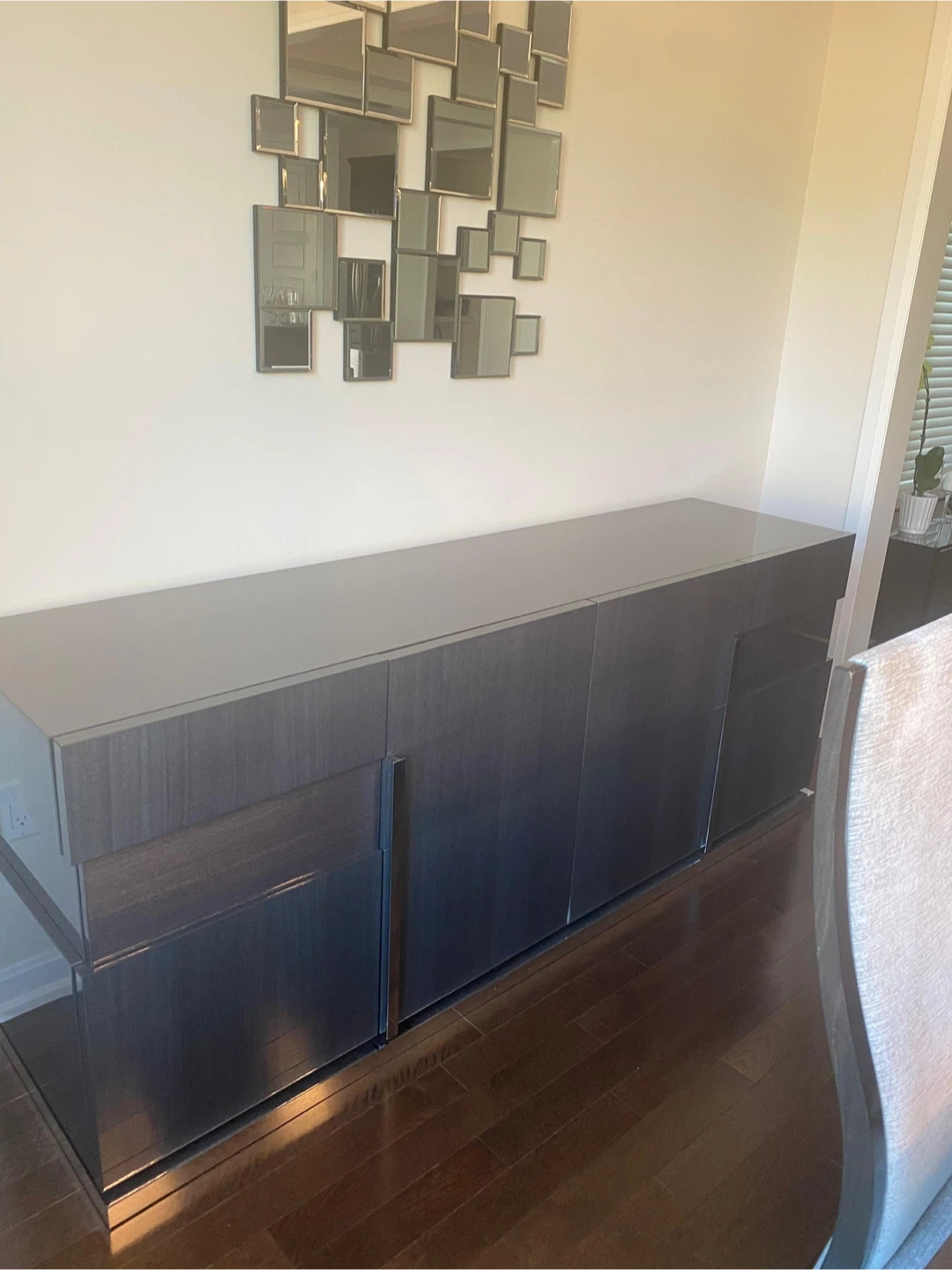 Italian crafted dinning table set includes - Exbandable dinning table (8 seats closed, 10 seats opened) - 8 chairs - Side table buffet (2 compartments) Country of Origin: Italy Colour: dark grey Material: lacquer Measurements: Table size: L= 77.25” | W= 42.5” | H= 30.5” Buffet size: L= 83” | W= 21” | H= 32.5” *Great condition, gently used, no damages, clean *Original value $10,000+