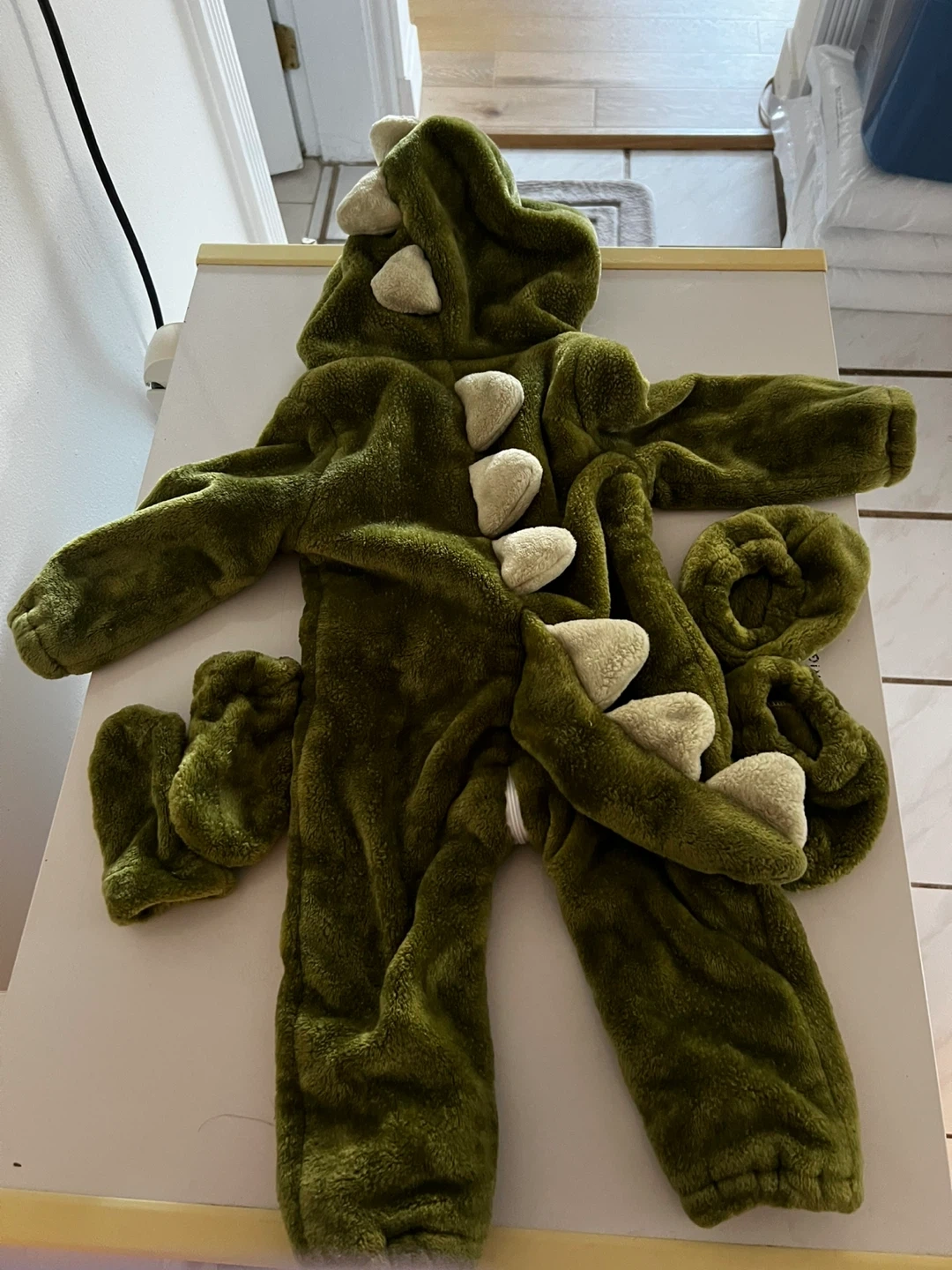 95Here's a super cute dinosaur costume! It's in great shape and perfect for dress-up or Halloween. It includes the full body suit with attached hood, and separate hand and foot covers to complete the look