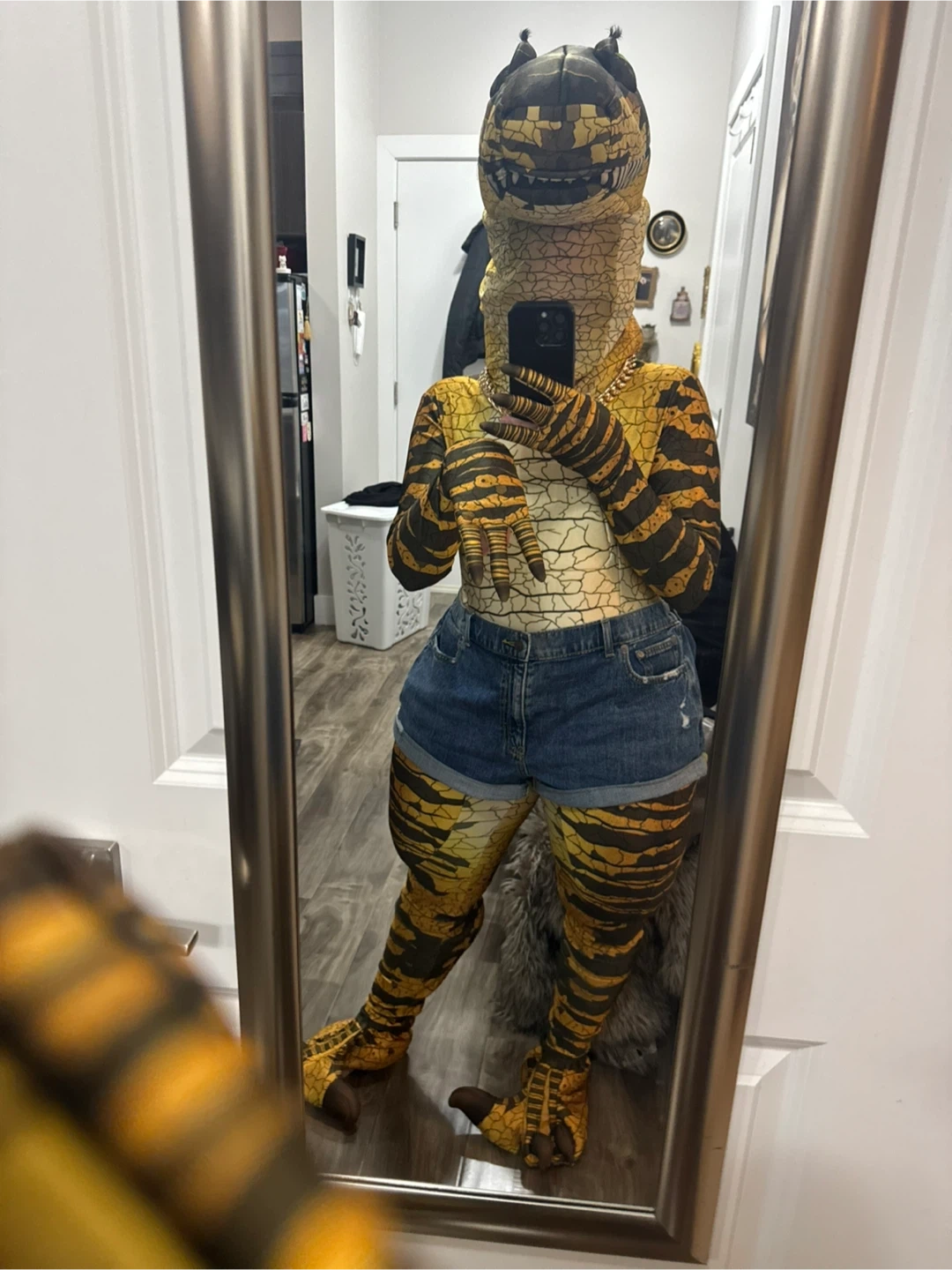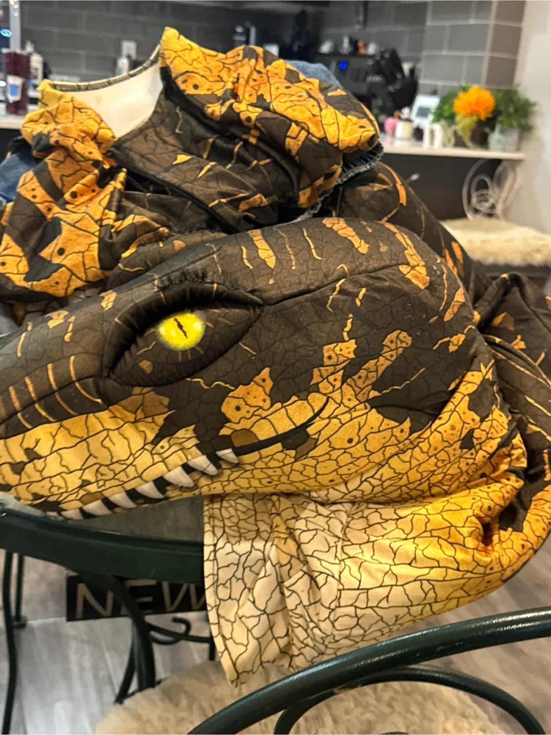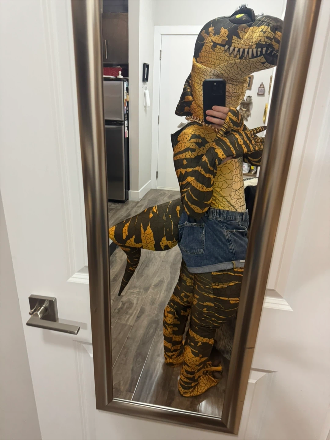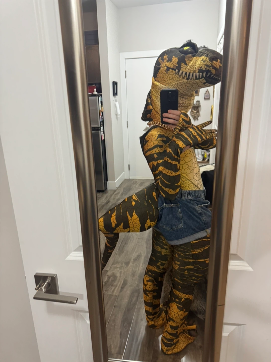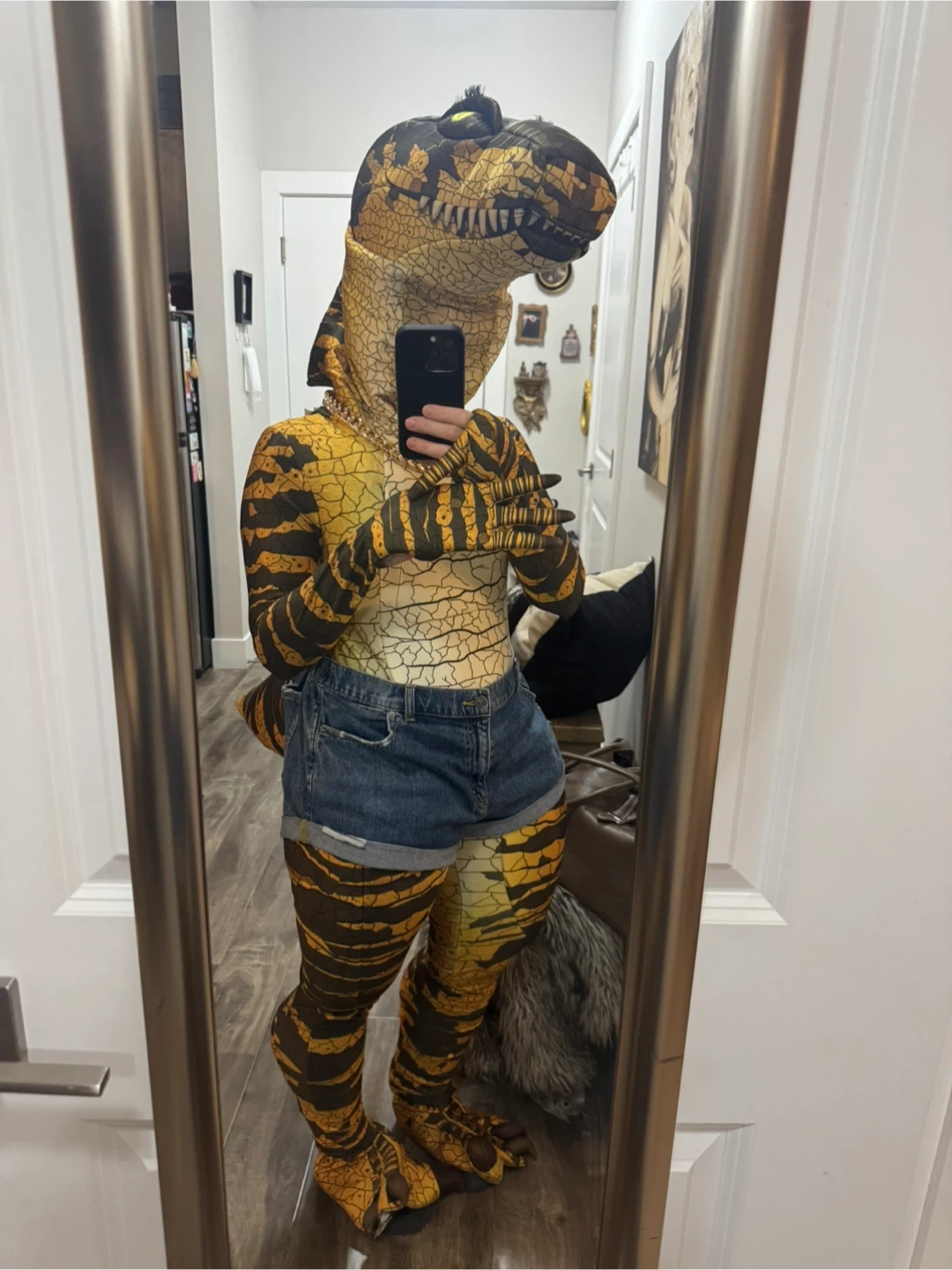 357Dinosaur costume womens sm/med Says xl but small med. ok quality, good for photos or videos. Says xl but would not fit someone over 5”4 as short torso. Can take off jean shorts. Chain not included. Body suit & head. Pick up only