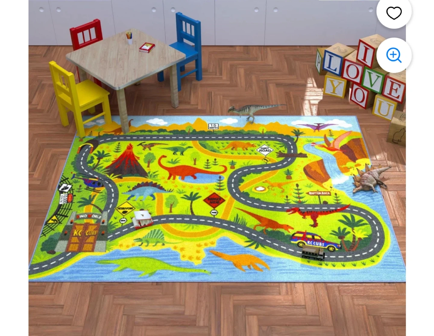 597Fun dinosaur-themed play mat rug! Perfect for a kid's room or play area. Features a colourful design with roads and dinosaurs, making it a great interactive piece. The rug has a soft texture and is easy to clean! 190x140 cm