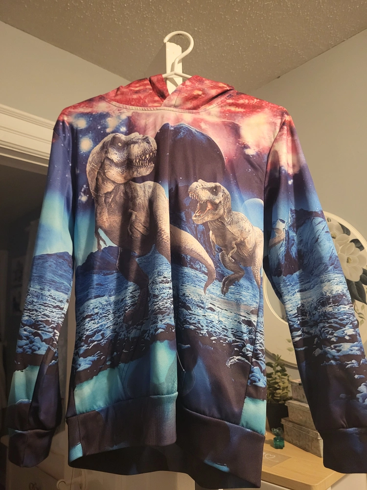 Cool dinosaur hoodie! It has a T-Rex print on a blue and red background. Great for any dinosaur lover!