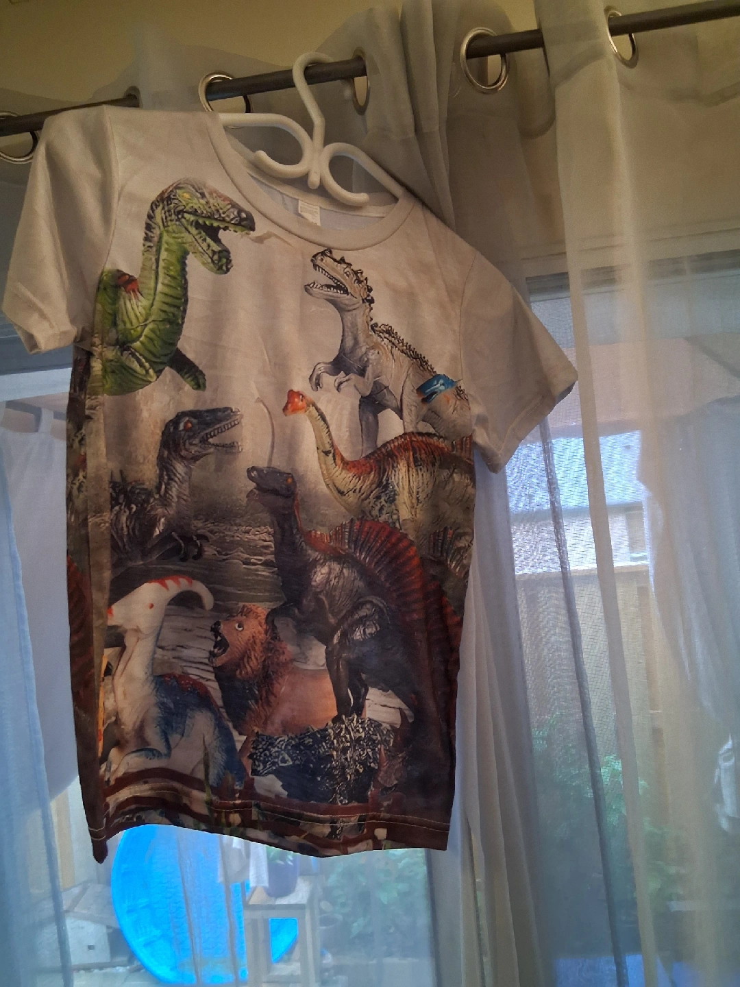 10Cool dinosaur print t-shirt! It's made of 100% polyester and the size is 160. Perfect for any young dino enthusiast