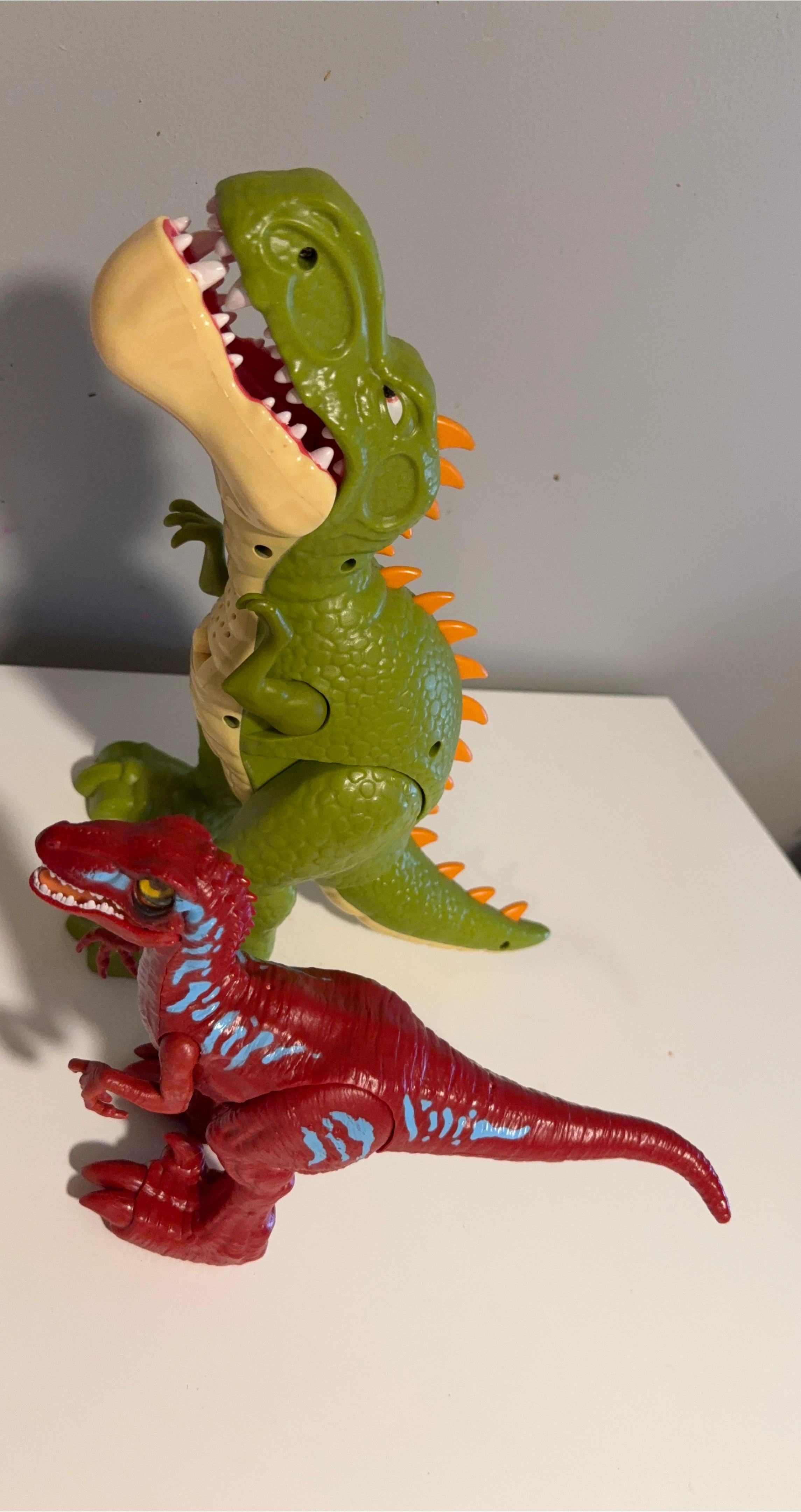Selling a couple of cool dinosaur toys! There's a green T-Rex and a red Raptor. They're in great shape and ready for a new home. Perfect for any dinosaur enthusiast! Selling for 25$