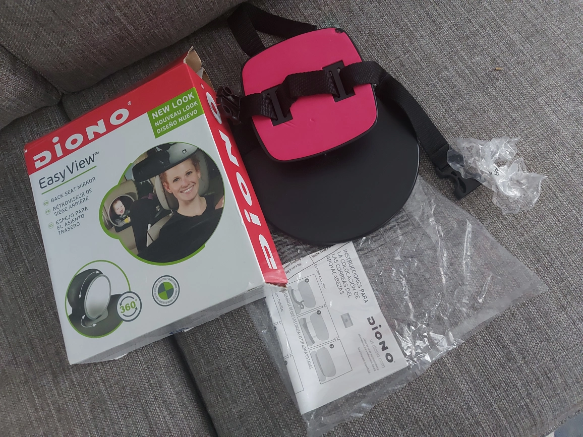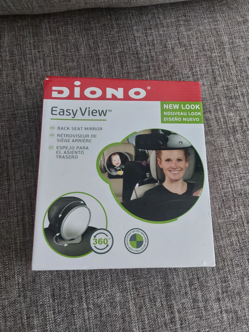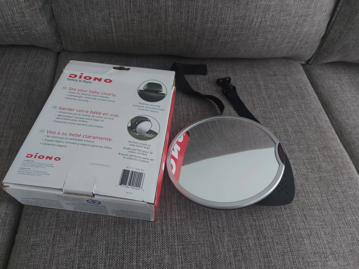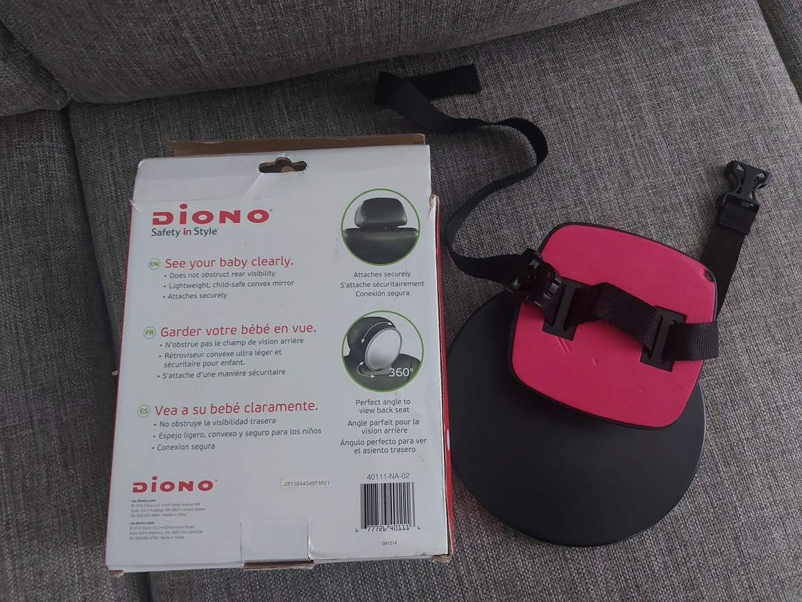 65This is a Diono EasyView Back Seat Mirror. The mirror is in the original packaging and is in good condition. It includes the mirror, adjustable strap, and instructions.
