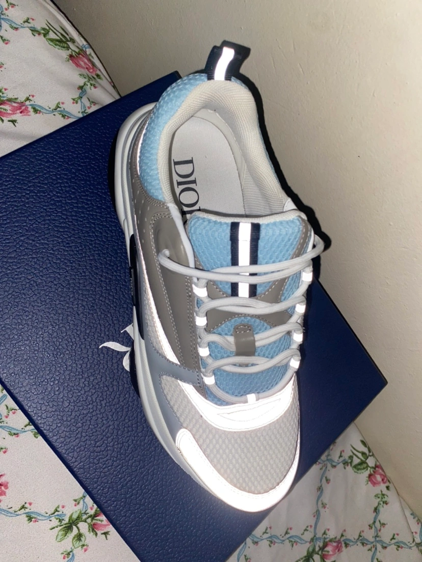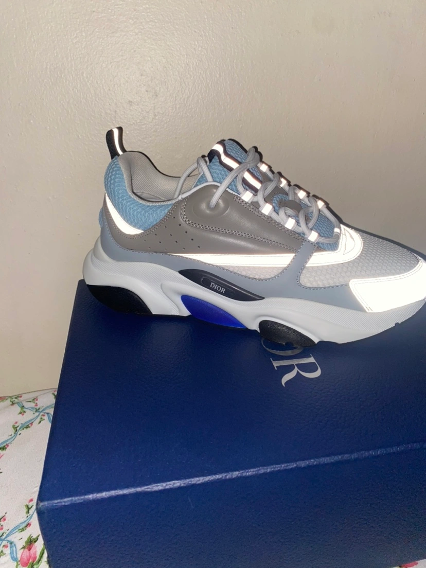 These are men's size 10.5 sneakers, in the colour grey, blue, and white. They are a low top, lace up style with a chunky sole. They come with the original box.