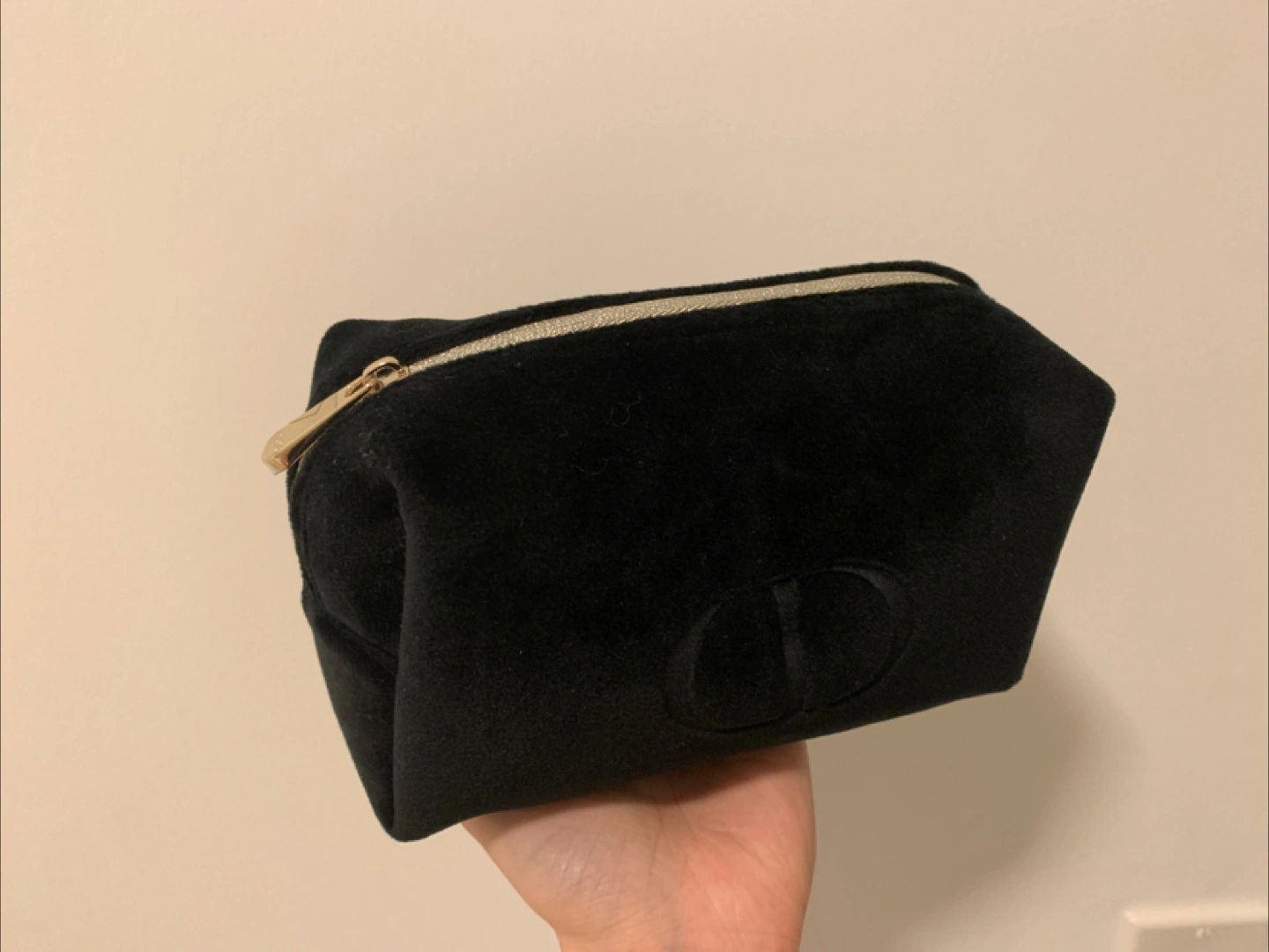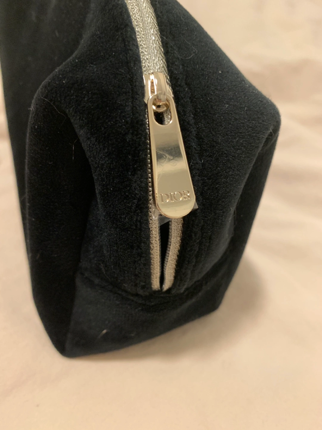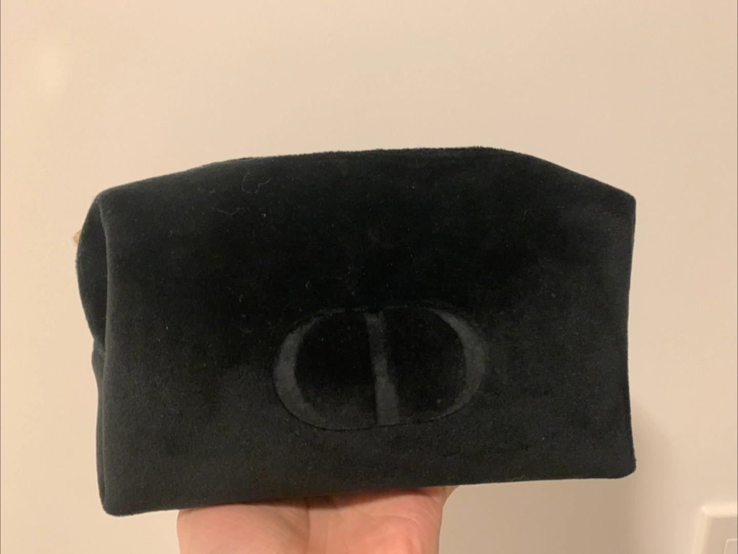 343A black velvet pouch with a zipper closure. Features the iconic CD logo. The inside is spacious, which would make it perfect for travel and keeping your cosmetics organised.
