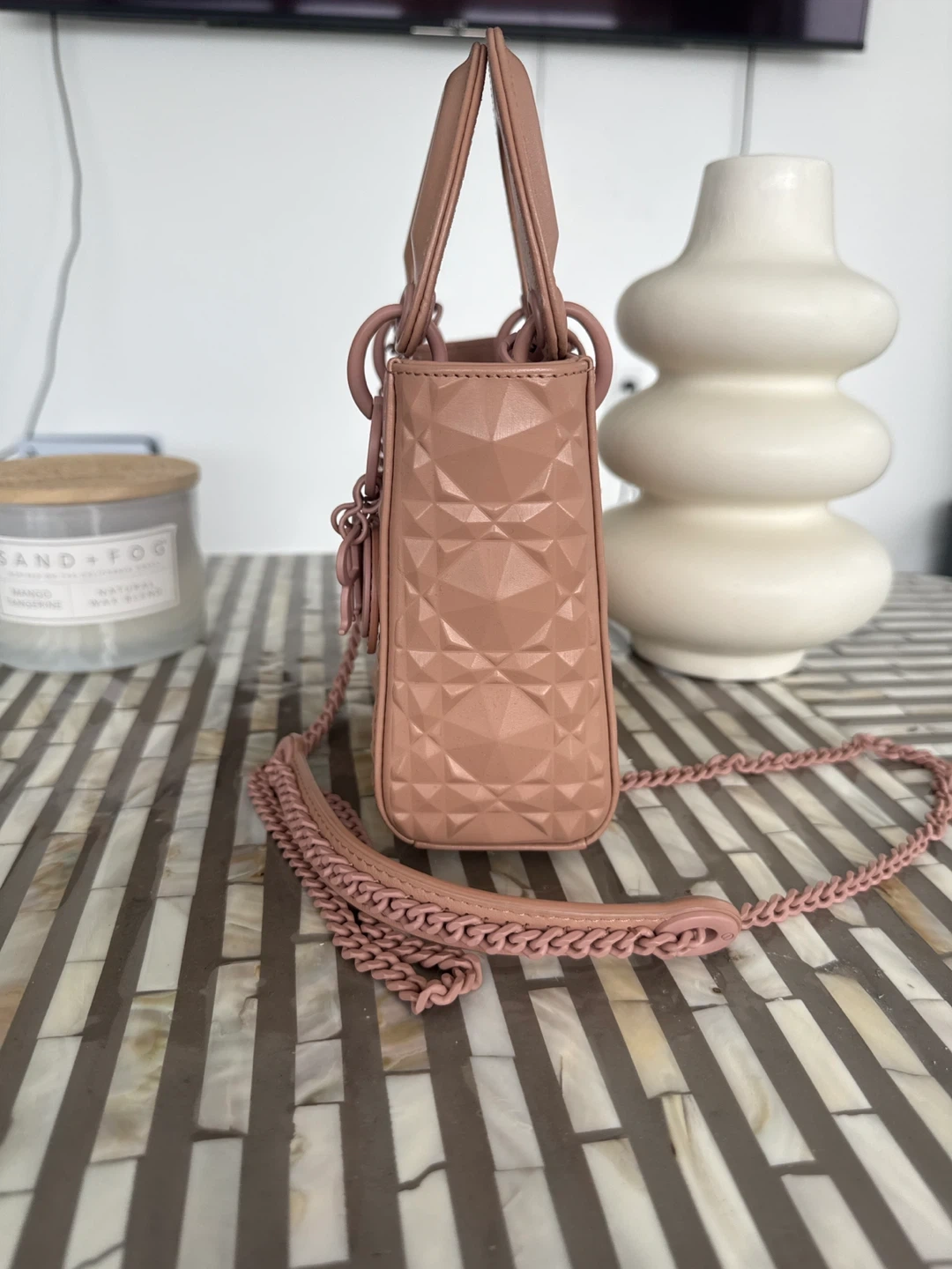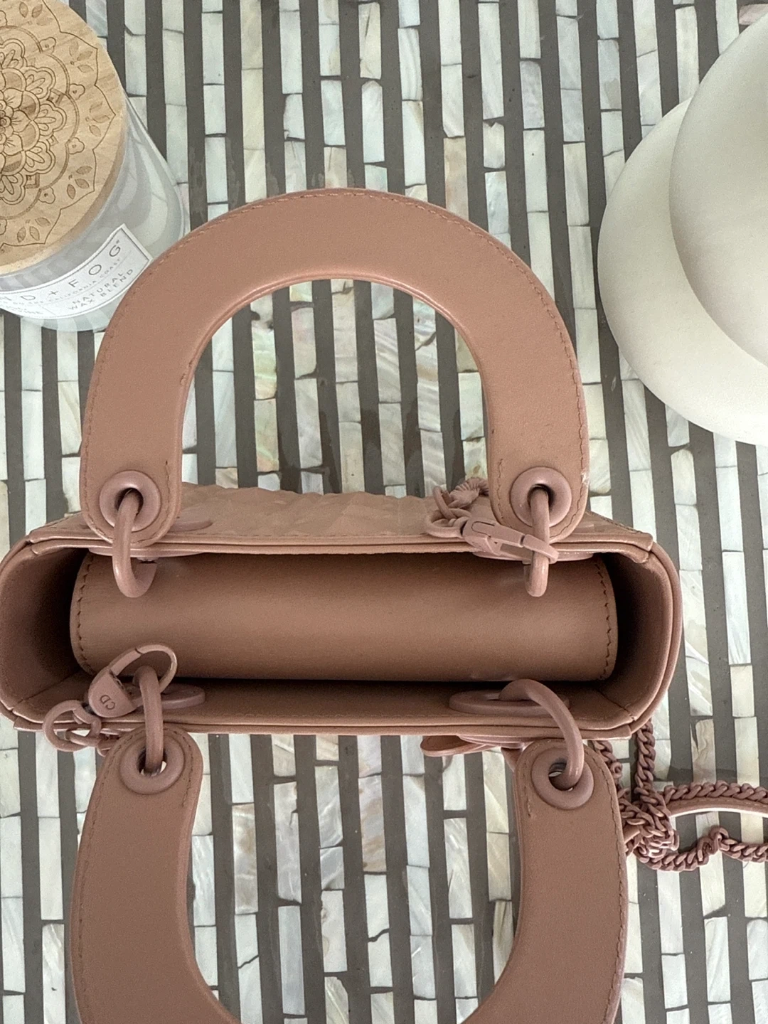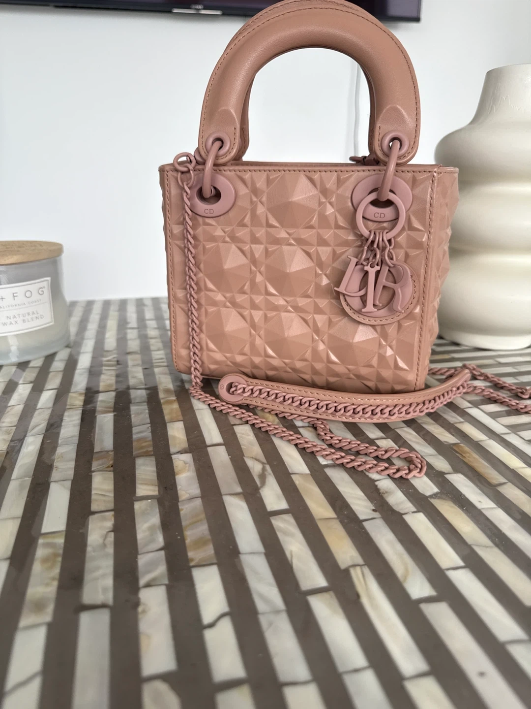 Selling a Mini Ultra Matte Lady Dior bag in a beautiful blush pink colour and the Diamond cannage motif in calfskin leather. It's in almost new condition and perfect for adding a touch of elegance to any outfit!