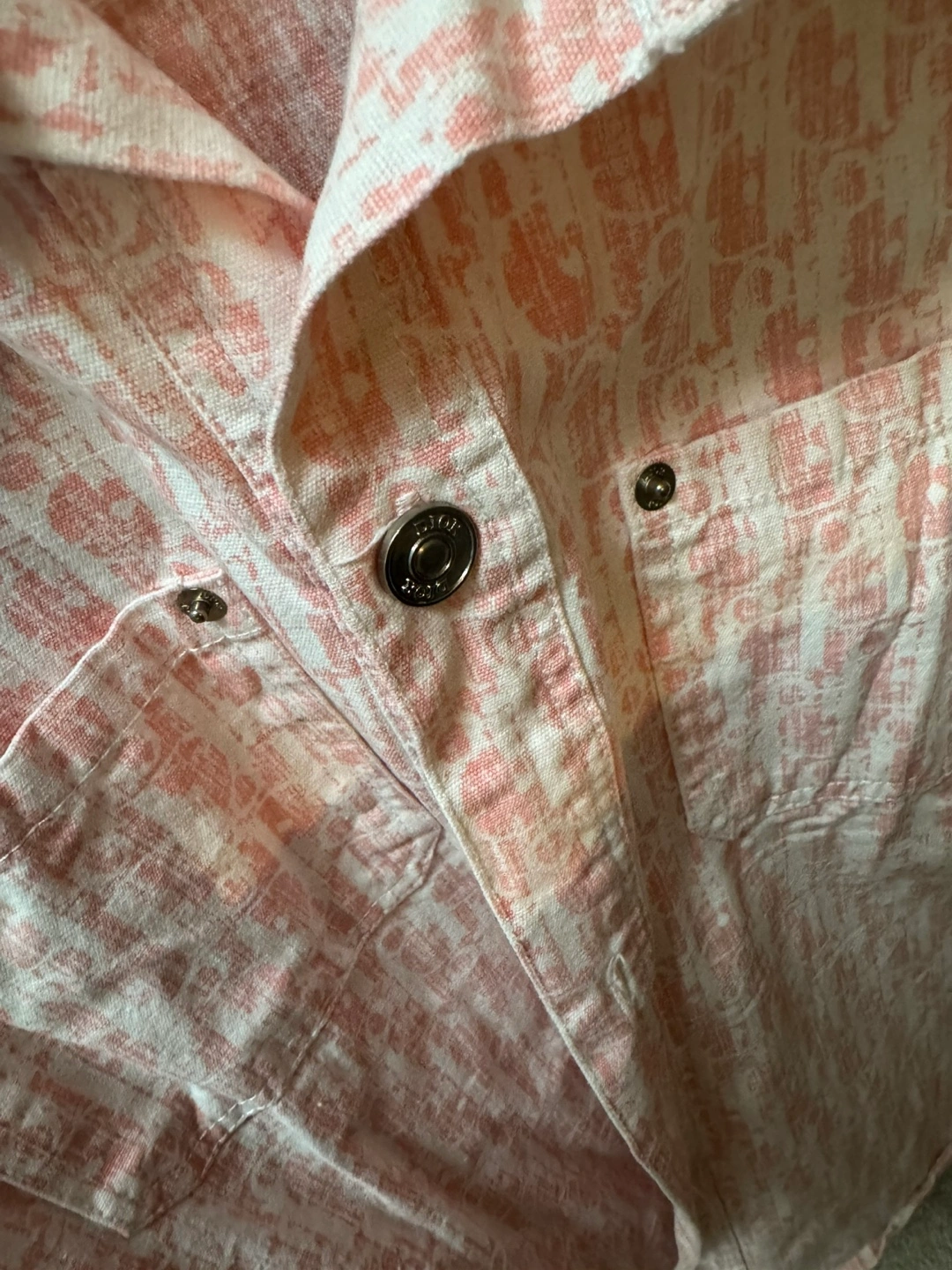 66Long-sleeved button-up shirt. Pink and white pattern. Two chest pockets. Made in Italy. 100% cotton. Size medium.