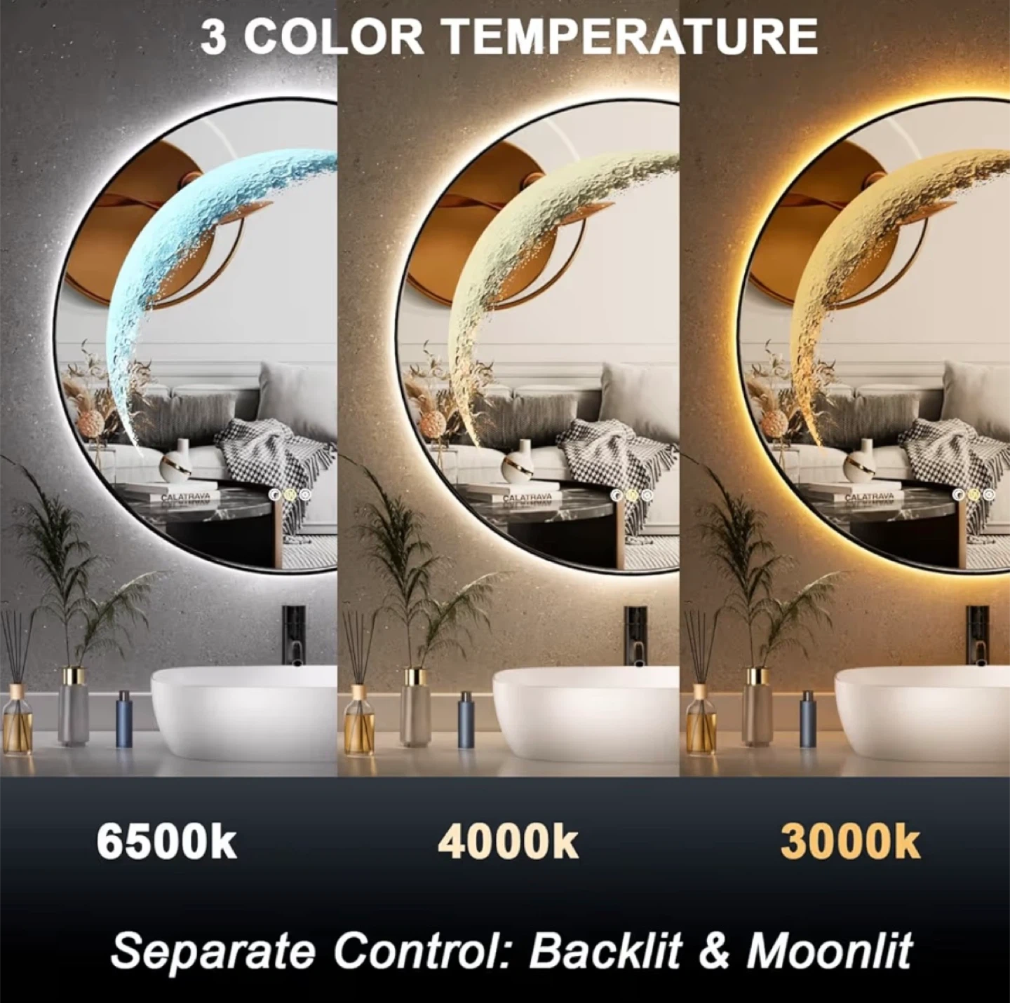 T This round mirror features a built-in LED light with three colour temperatures (6500k, 4000k, 3000k) and stepless dimming. It also has a smart anti-fog function that auto-off after 30 minutes. The backlight and moonlit effect can be controlled separately. It's great for a bathroom vanity.