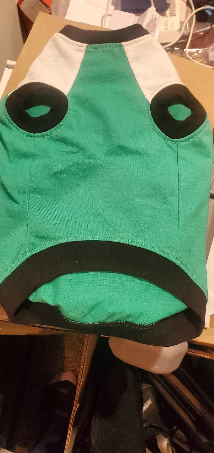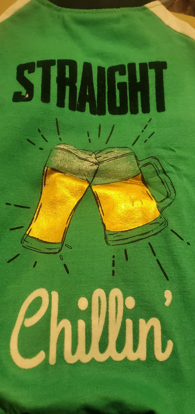 Green dog t-shirt. Size medium. Features a "Straight Chillin'" design with beer mugs. 65% polyester, 35% cotton. Hand wash in cold water. Do not bleach. Air dry.