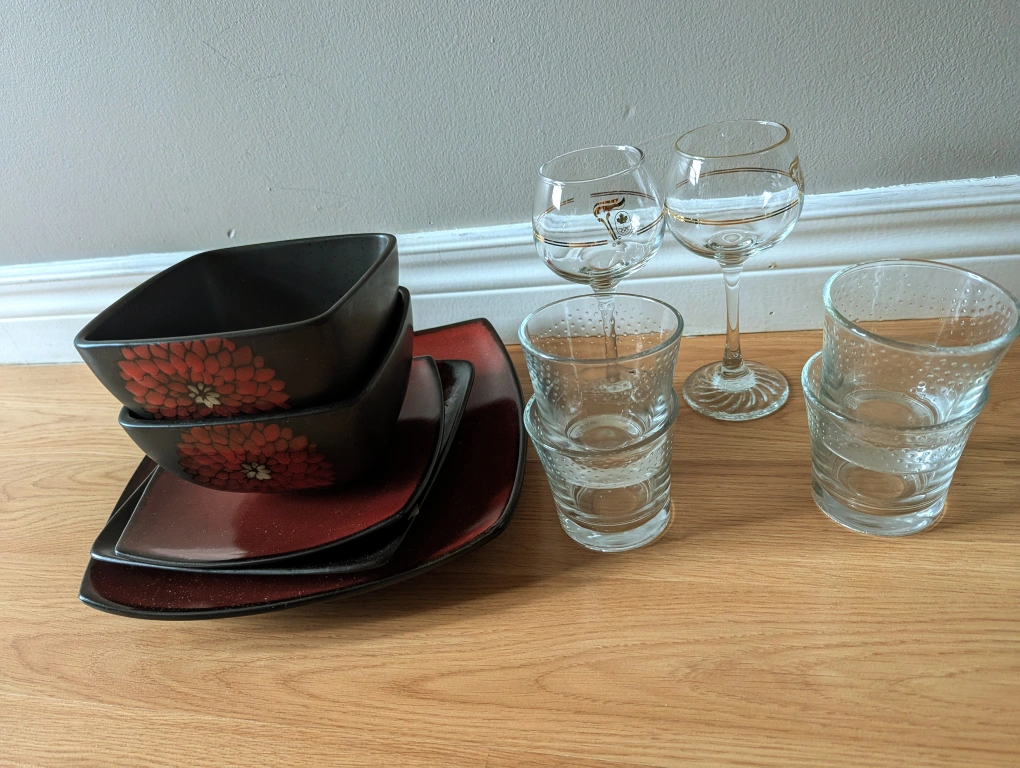 10Selling a set of dishes, bowls, and glasses. They are in good condition and ready for a new home! The set includes square bowls with a floral design, square plates, wine glasses, and textured drinking glasses