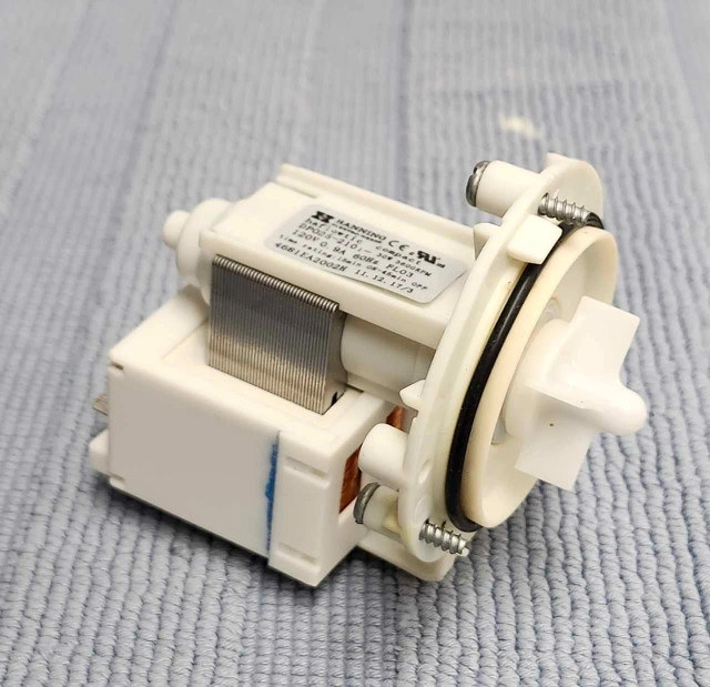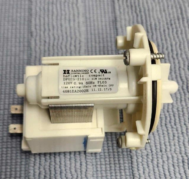10This is a Hanning Electric Werke haflowtic compact dish washer drain pump, model DP025-210. It operates at 120V, 0.9A, 60Hz, 30W, and 3600RPM. This pump is new. Tried on my dishwasher. I had to replace my dishwasher as there were some other problems with it. * Brand: Hanning Electric Werke * Model: DP025-210 * Voltage: 120V * Current: 0.9A * Frequency: 60Hz * Power: 30W * Speed: 3600RPM If the ad is still up, then it's still available!