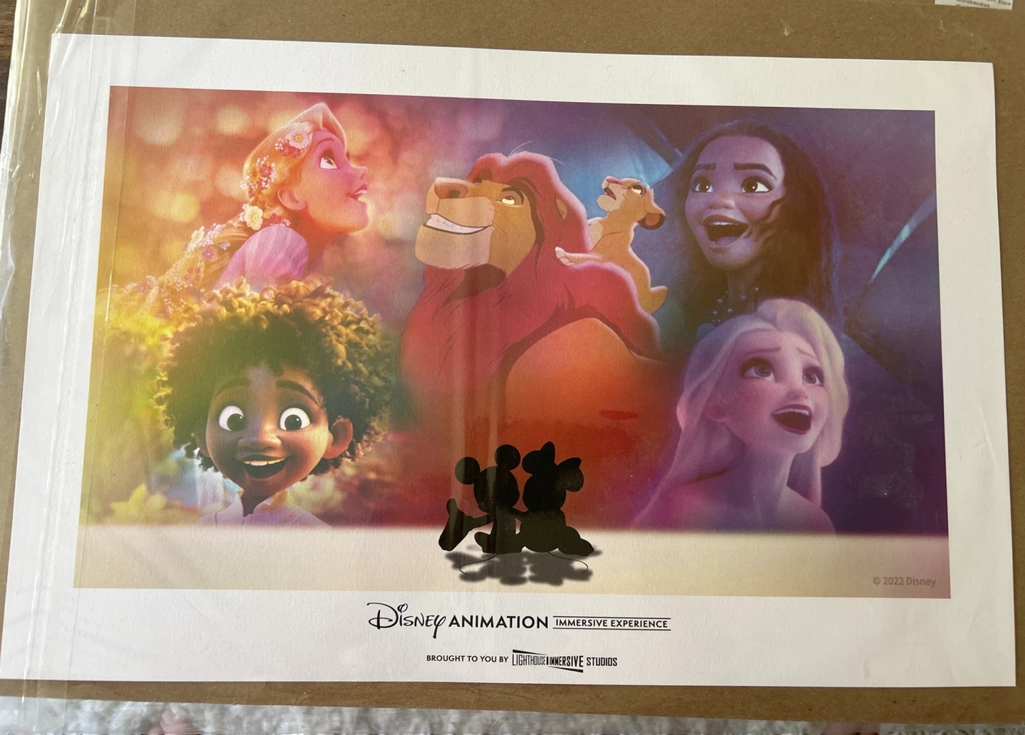 Selling a print from the Disney Animation Immersive Experience! It features characters from movies like Tangled, The Lion King, Moana, Frozen, and Encanto. A great piece for any Disney fan