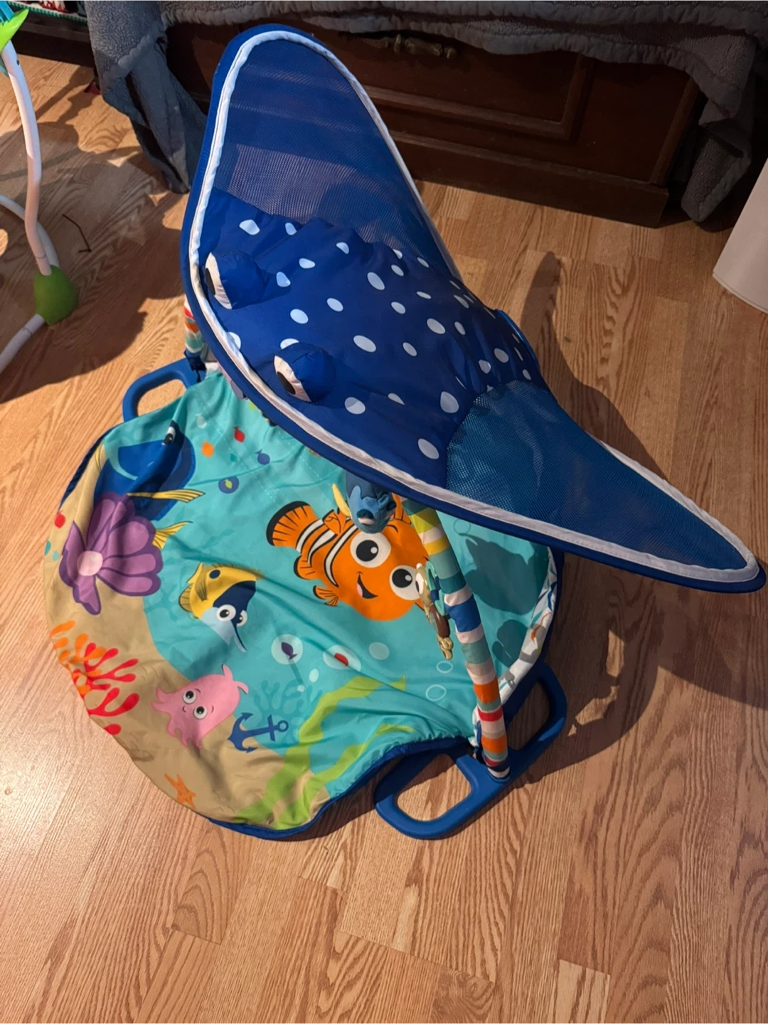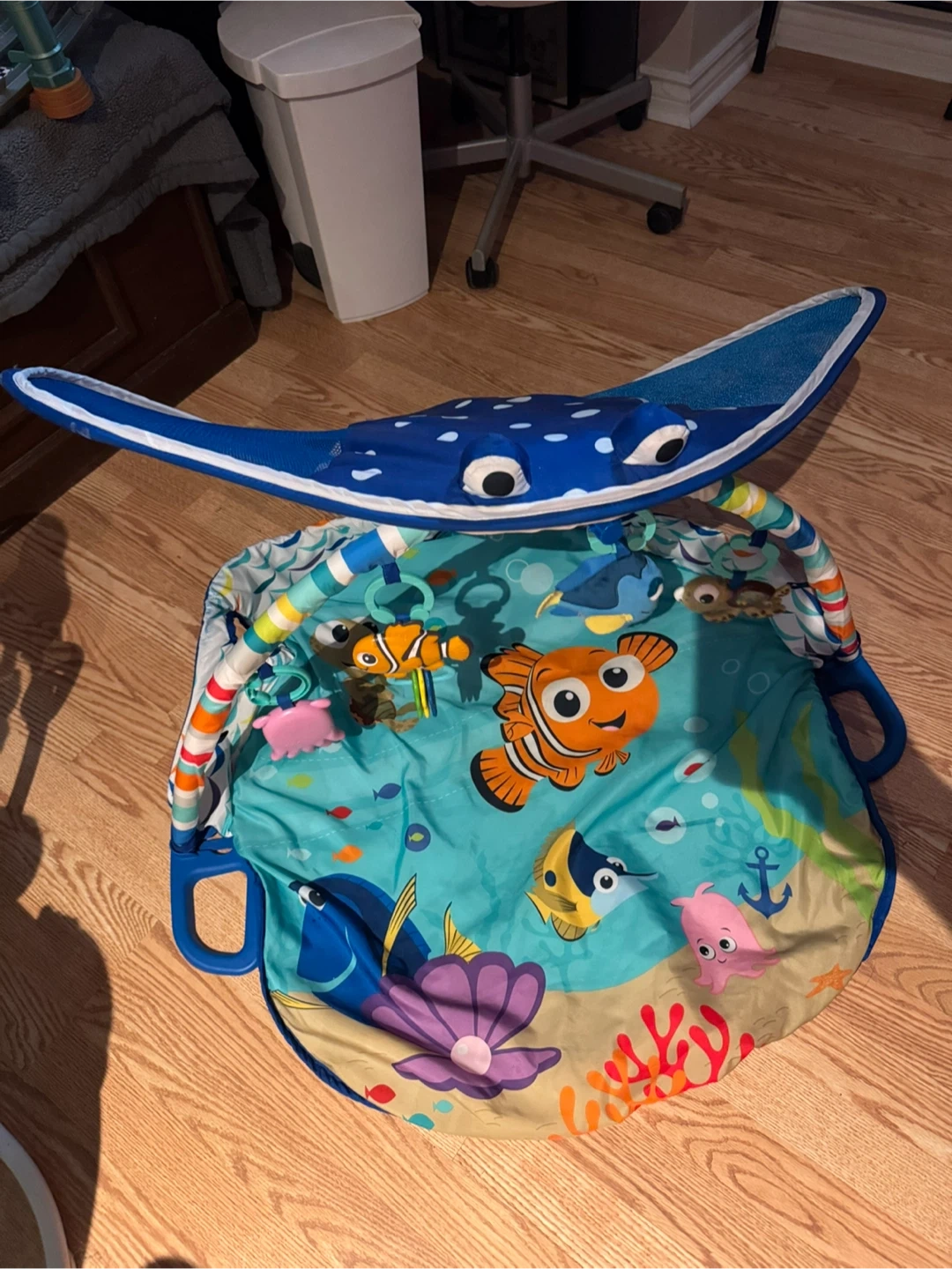 This Finding Nemo themed activity gym is perfect for your little one! It features bright colours and familiar characters from the movie. It's in great condition and ready for a new home! The activity gym includes a soft mat, overhead arches, and hanging toys to encourage reaching, batting, and tummy time play