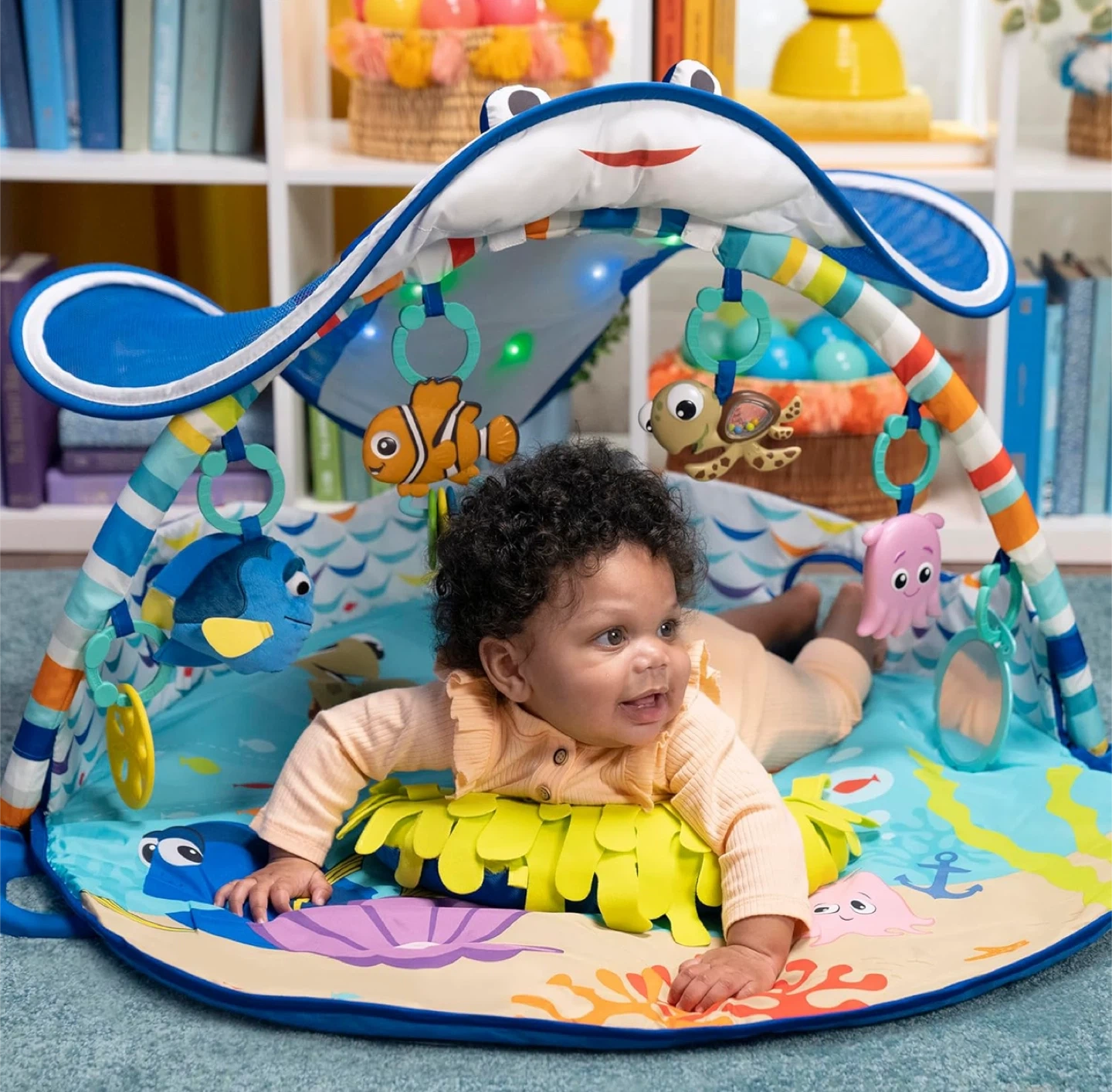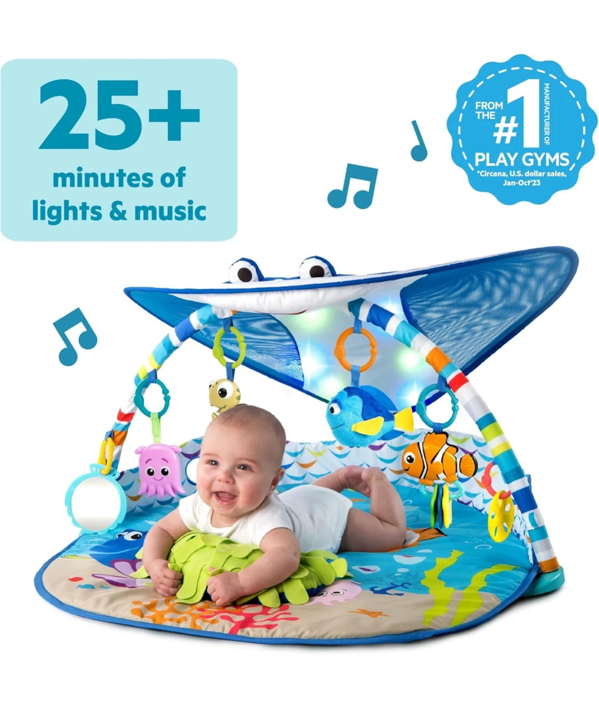 84This adorable Disney Baby Finding Nemo themed play gym is perfect for your little one! It features: - 25+ minutes of lights and music - A variety of toys including a Pearl rattle toy, Squirt rattle toy, Nemo bead chaser, Dory plush, baby safe mirror, and texture toy - A comfy tummy time pillow It's from the #1 manufacturer of play gyms!