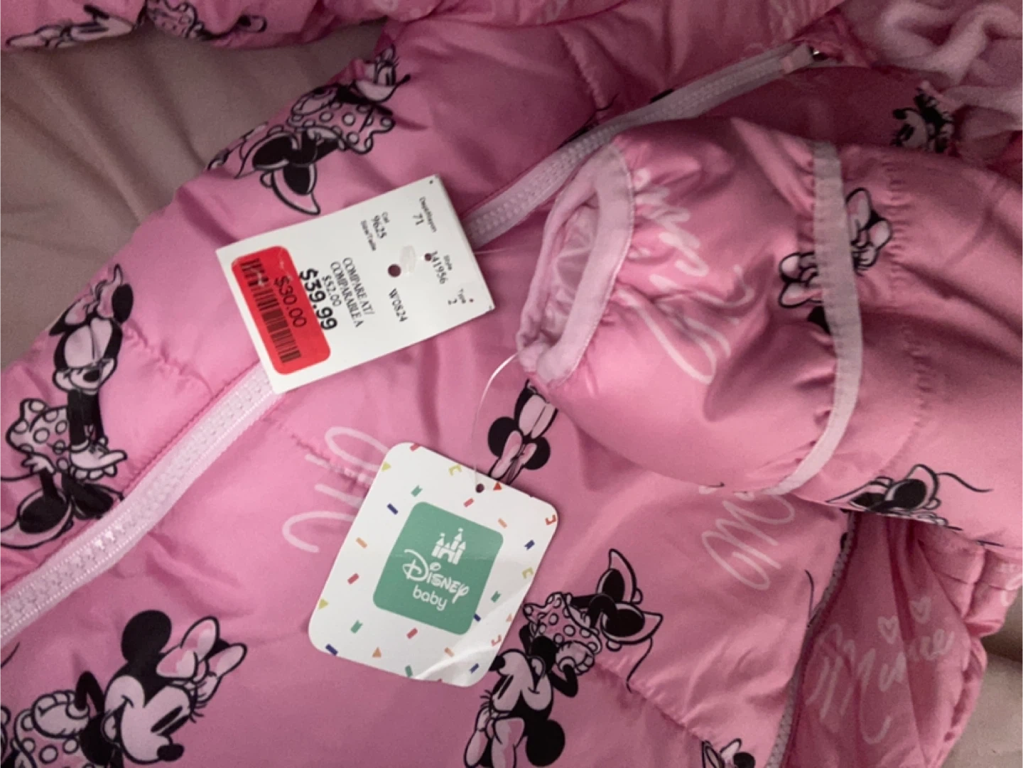 10This adorable Disney Baby Minnie Mouse snowsuit is perfect for keeping your little one warm and cozy this winter! It's pink with a cute Minnie Mouse pattern all over. Size 18m /24 Originally priced at $59.99!