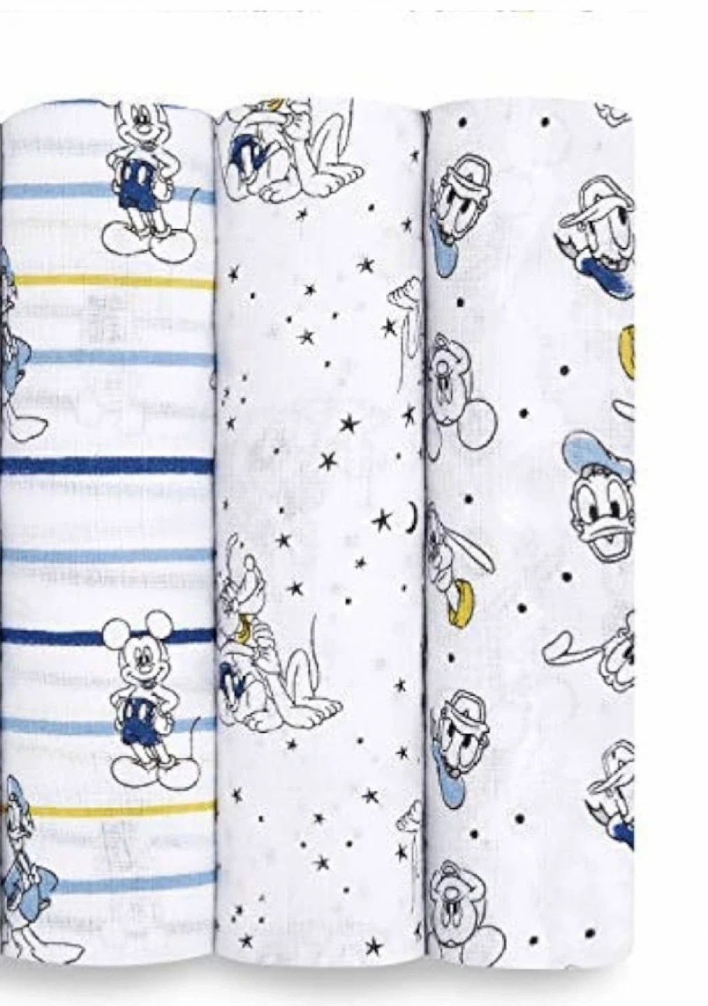 39aden + anais Disney, Swaddle Blanket, Boutique Muslin Blankets for Baby Girls and Boys, Newborn Receiving Blanket for Swaddling, 100% Cotton Baby Swaddle Wrap, 3 Pack, These adorable Disney Baby swaddle blankets come in a pack of three! Each blanket features a different design with classic Disney characters like Mickey Mouse, Pluto, and Donald Duck. Perfect for keeping your little one cozy and comfortable.