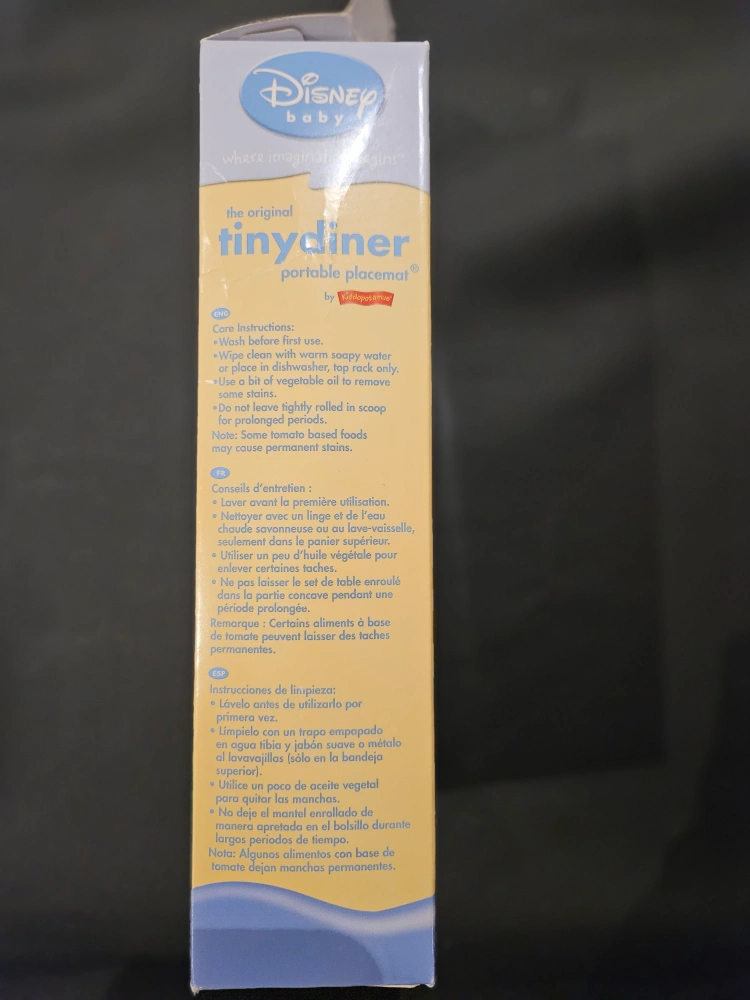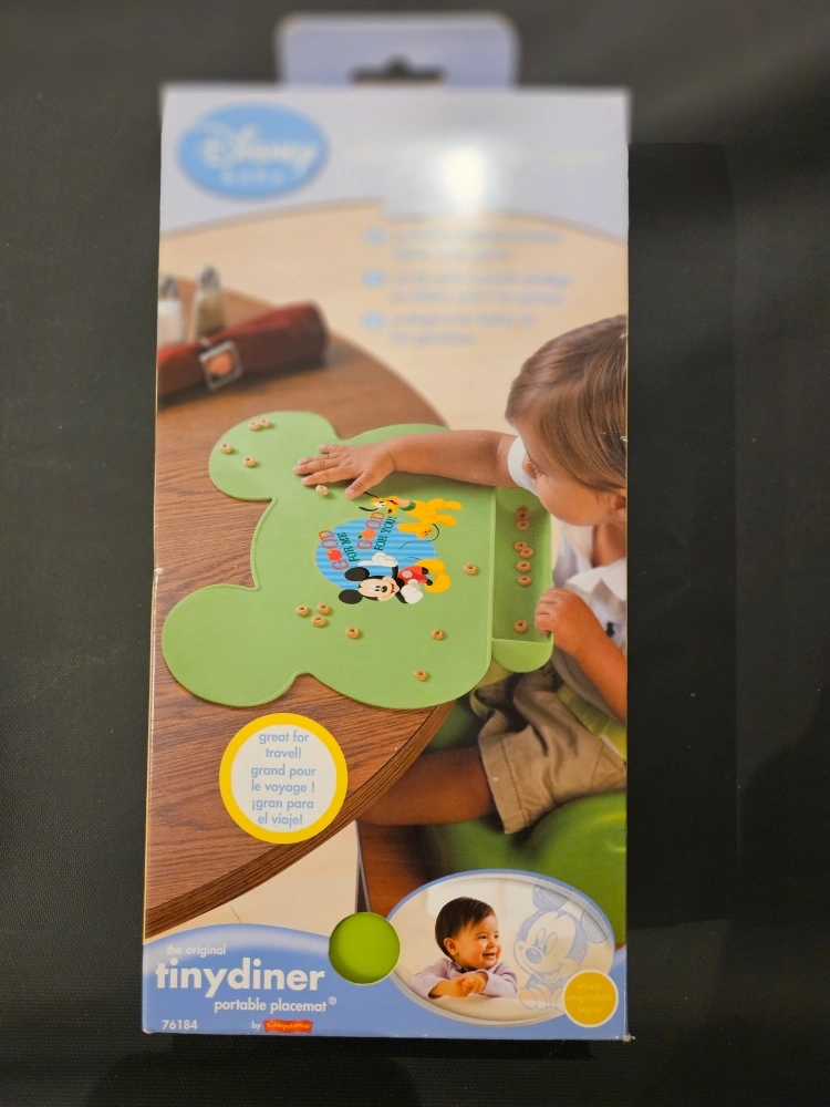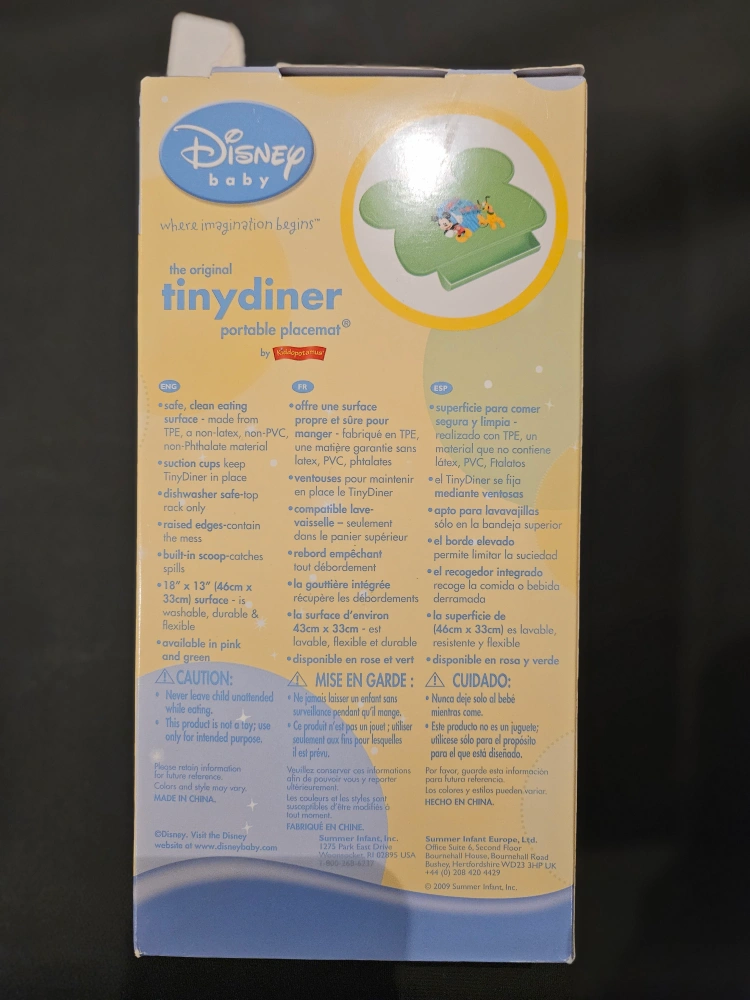 I'm selling a brand new Disney Baby TinyDiner portable placemat! It's the original TinyDiner by Summer Infant. - Safe and clean surface - Made from food-grade TPE, a non-toxic, non-PVC, non-Phthalate material - Suction cups keep TinyDiner in place - Dishwasher safe—top rack only - Raised edges contain spills - Built-in scoop catches spills - Size is 18 x 13" (46cm x 33cm) - Surface is washable, durable & flexible - Available in pink and green Great for travel!