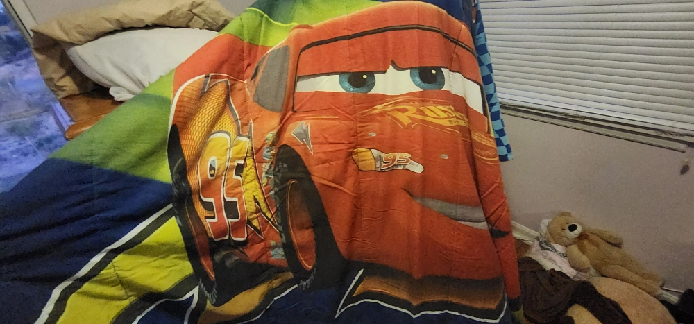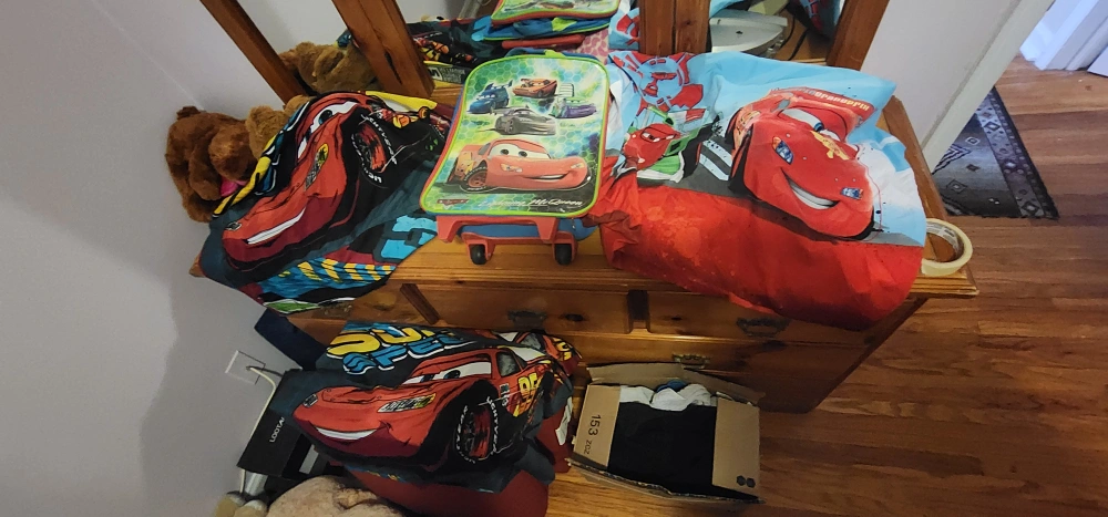 Disney Cars themed bedding set for a kid's room. Includes a comforter and other bedding and luggage. Perfect for any young Cars fan!