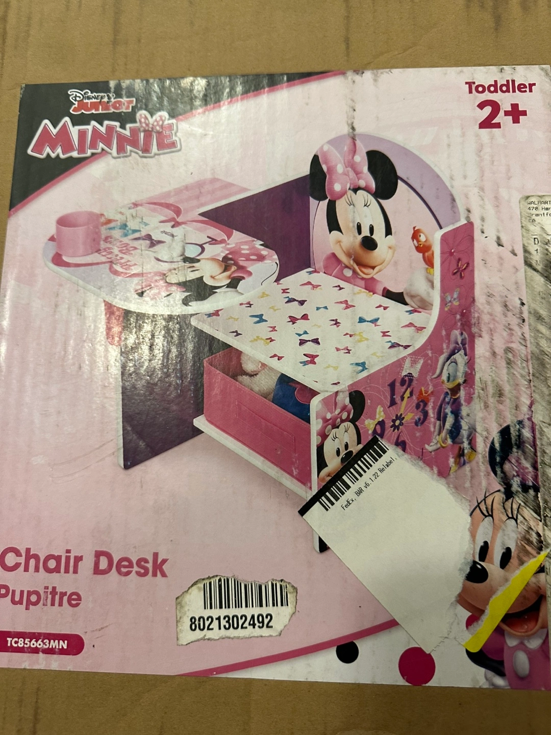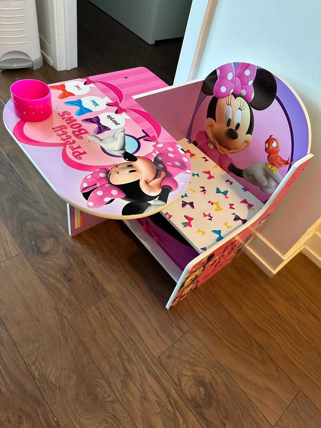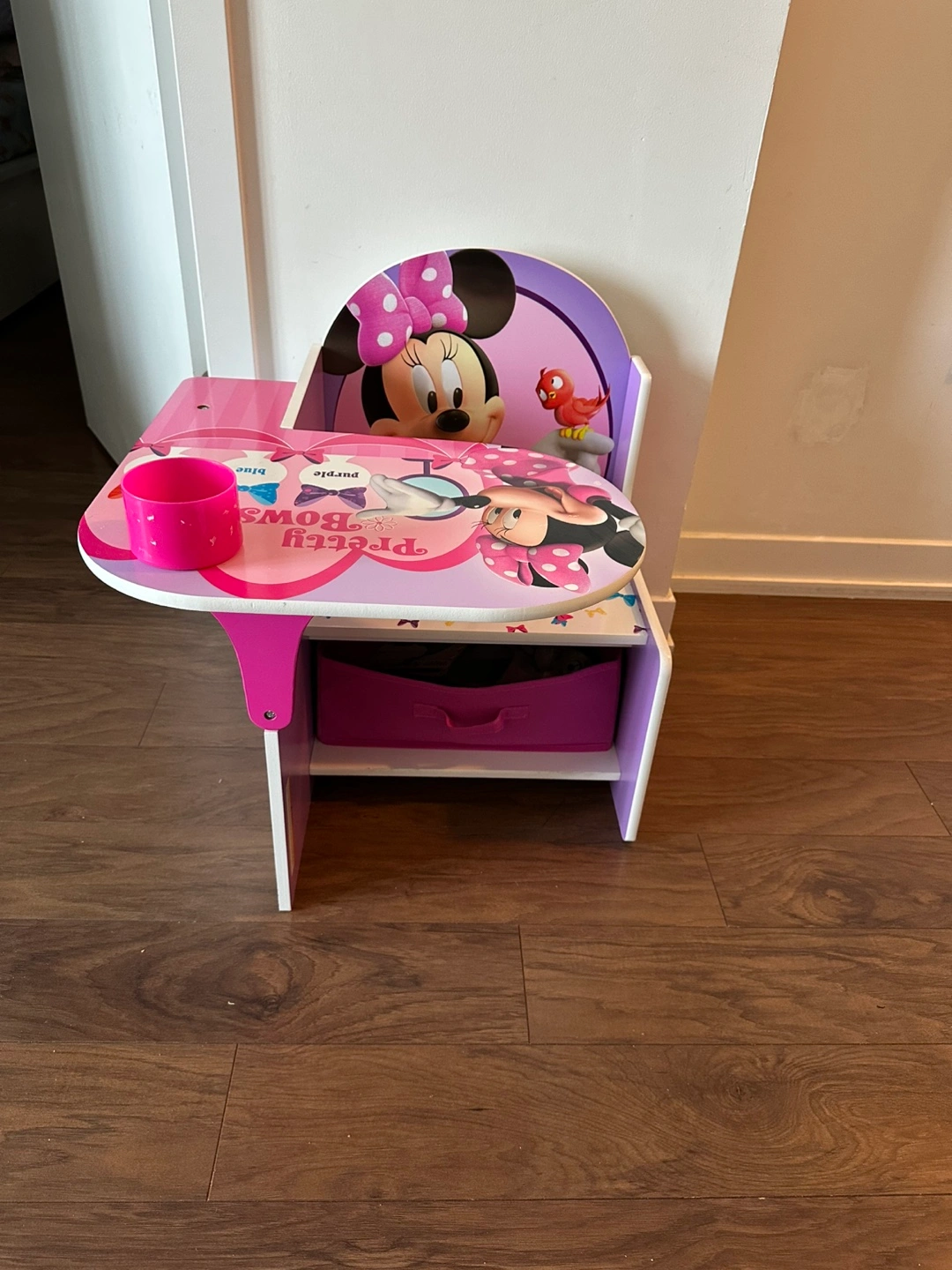 This adorable chair desk is a wonderful piece to have for your child. This desk features a Minnie Mouse design, with pink colours. It includes a desk space, a chair, and a storage bin. The chair desk is made for toddlers. Lightly used Please check my other listings too