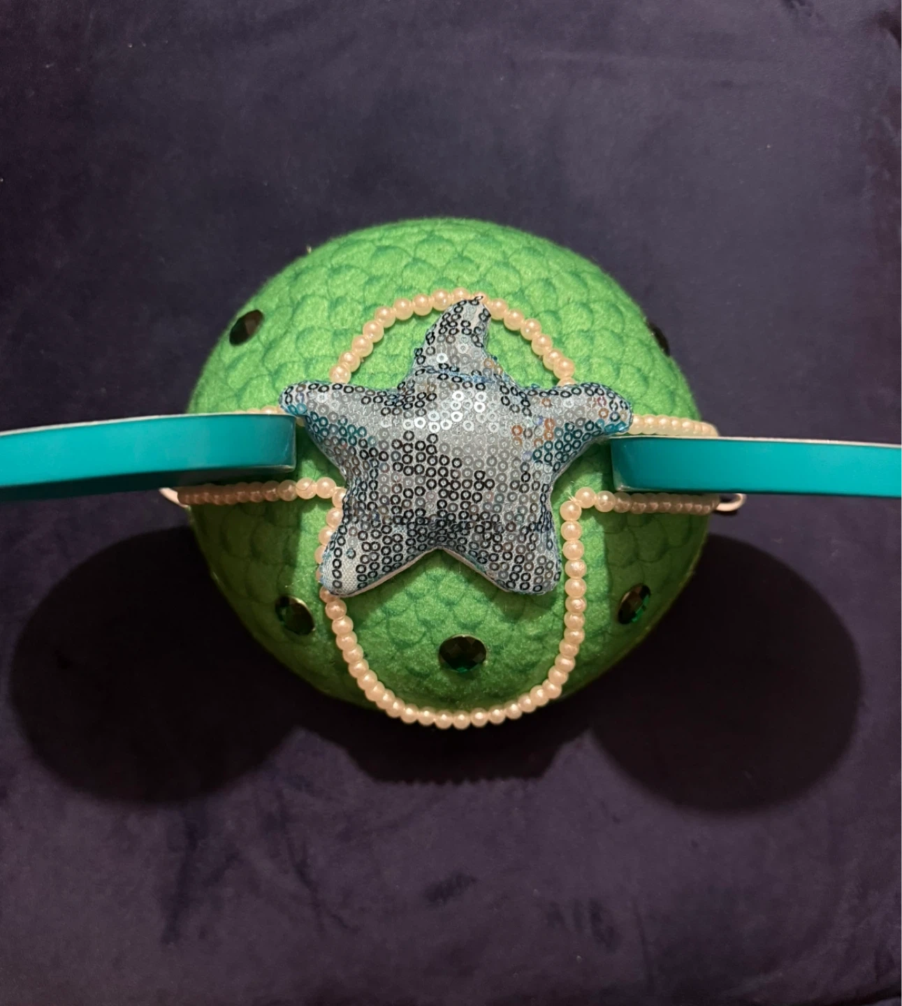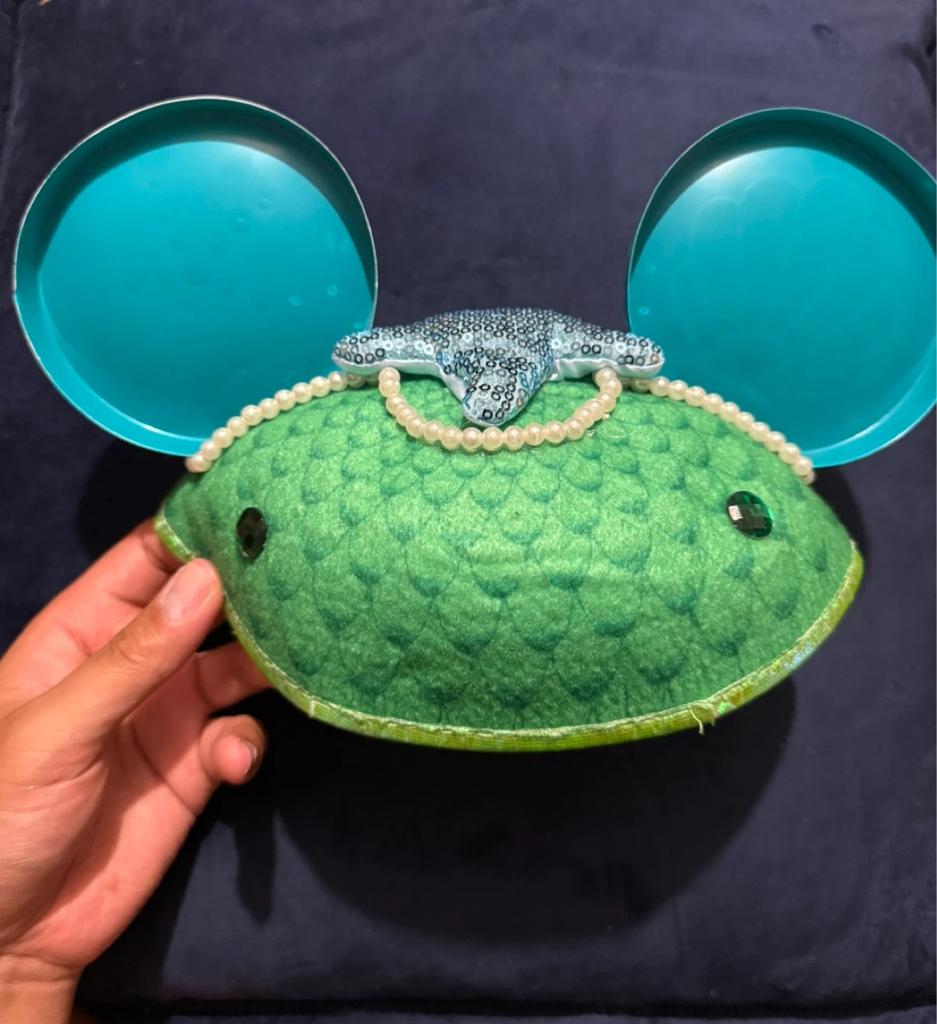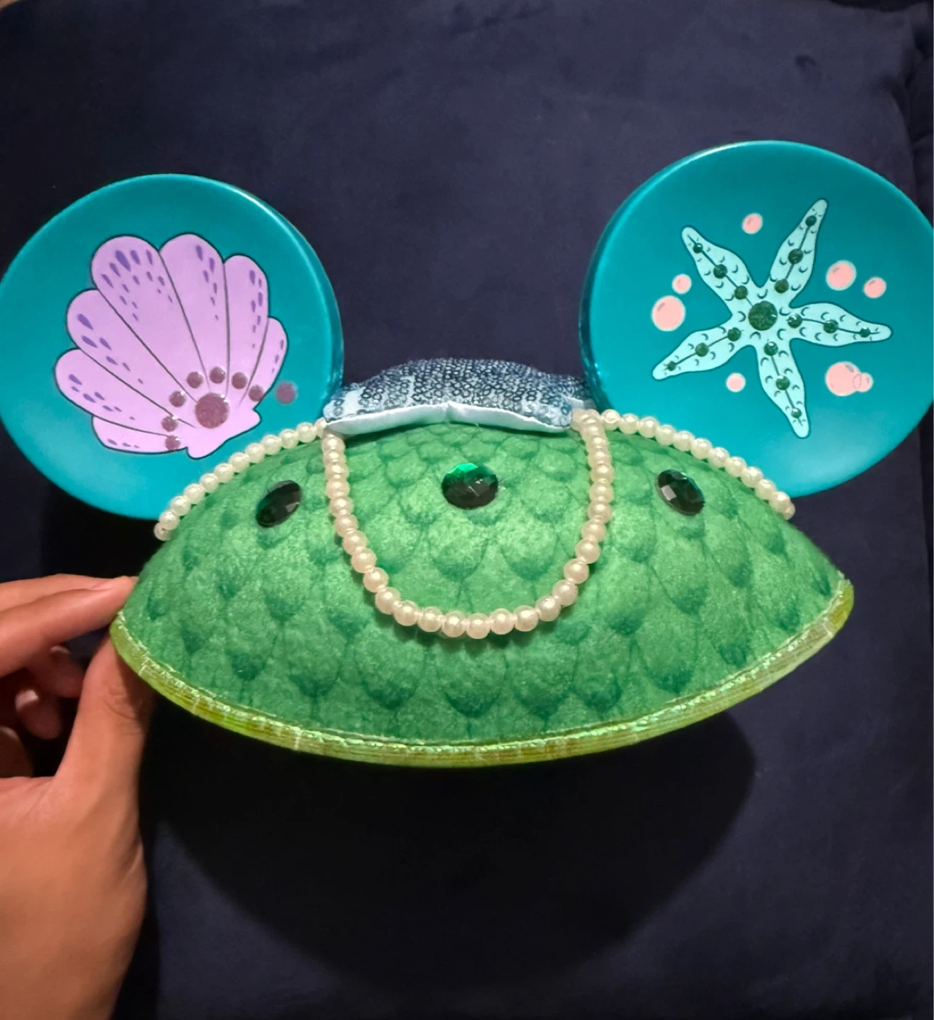 Selling a Disney Little Mermaid themed ear hat from the Disney Parks. It features a green jewels with pearl accents and turquoise ears with sea shell and starfish designs. Perfect for a Disney fan or Little Mermaid! Worn only a couple of times.