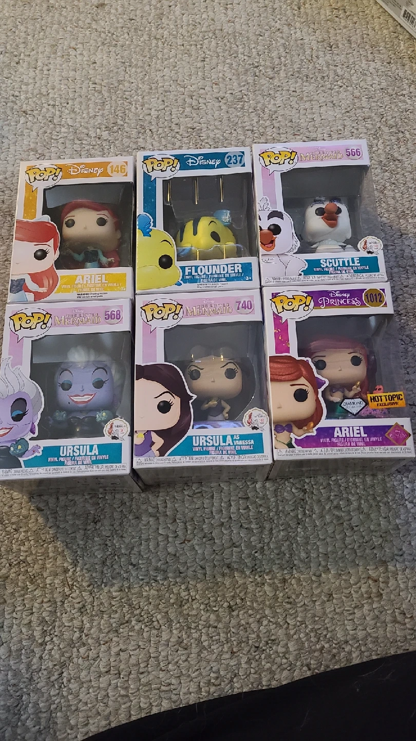 73Selling a collection of Disney's Little Mermaid Funko Pops! Includes Ariel (various versions), Flounder, Scuttle, and Ursula. All figures are in their original boxes and in great condition. Perfect for any Disney or Funko collector! Prices for each, OBO