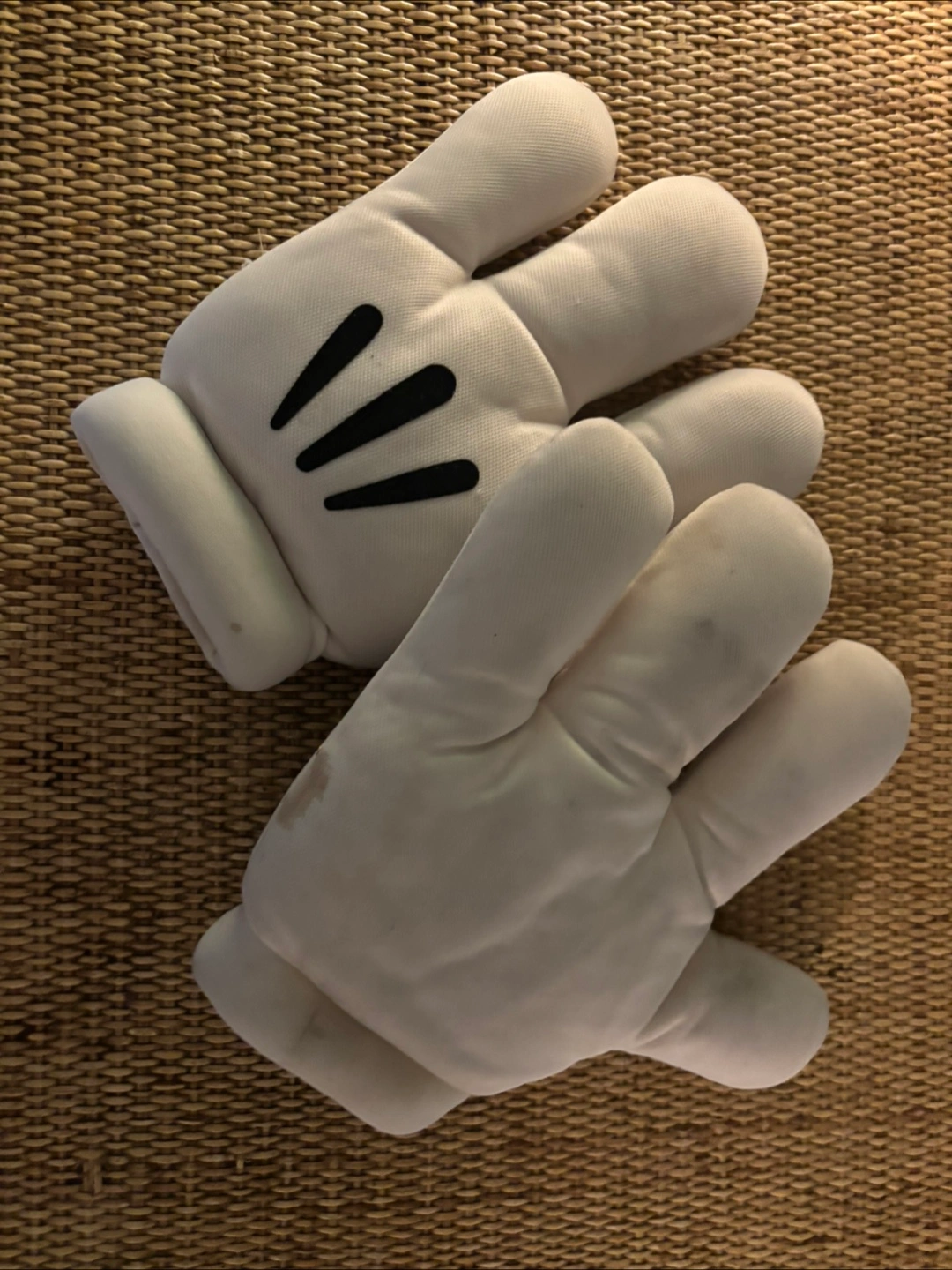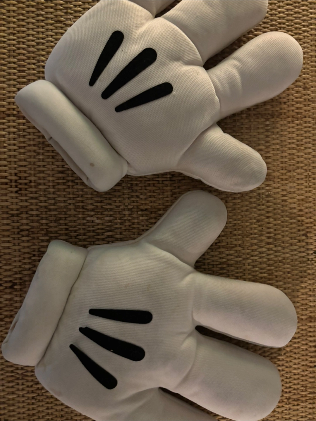 Selling a pair of Disney Mickey Mouse glove hands! They're in good condition, perfect for a costume or just for fun. They are white with black accents, just like Mickey's classic gloves
