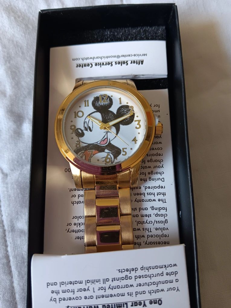 Selling a Disney Mickey Mouse gold watch. It comes with the original box and warranty paperwork. A fun and stylish accessory for any Disney fan!