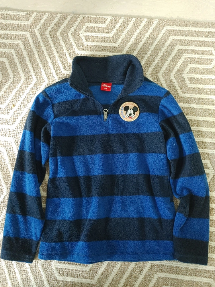 97Striped blue and black fleece pullover. Size 2XL. Features a Mickey Mouse emblem on the front. 10$ each.