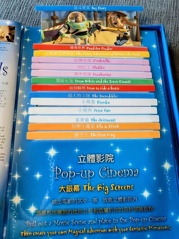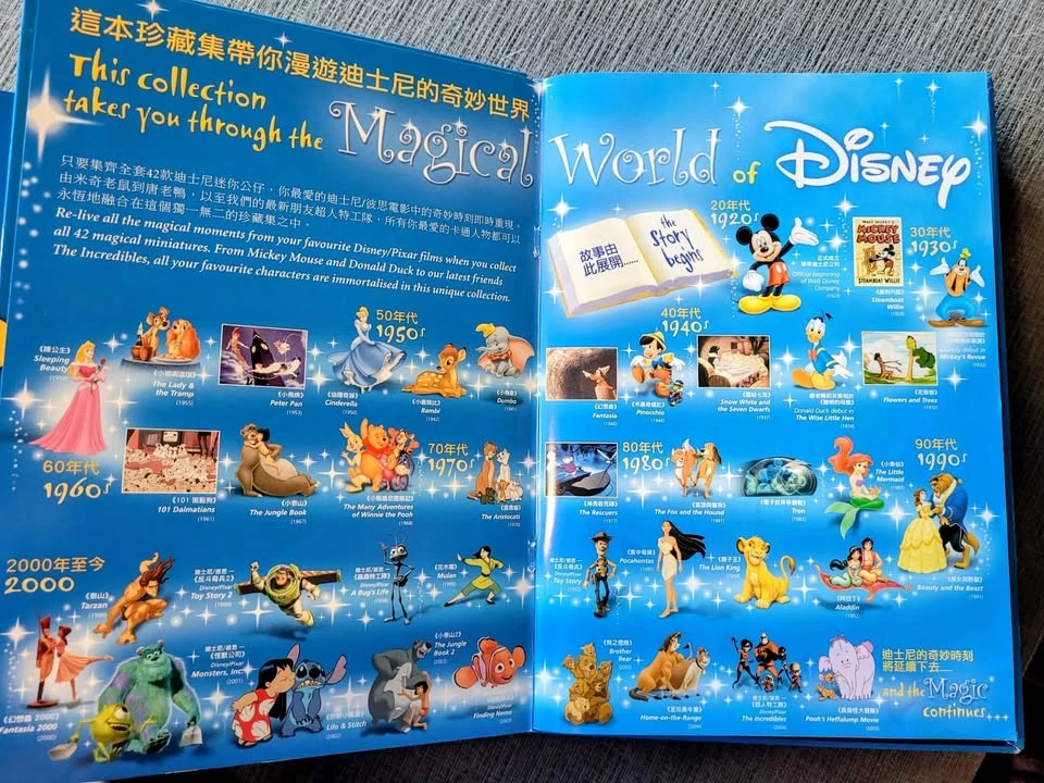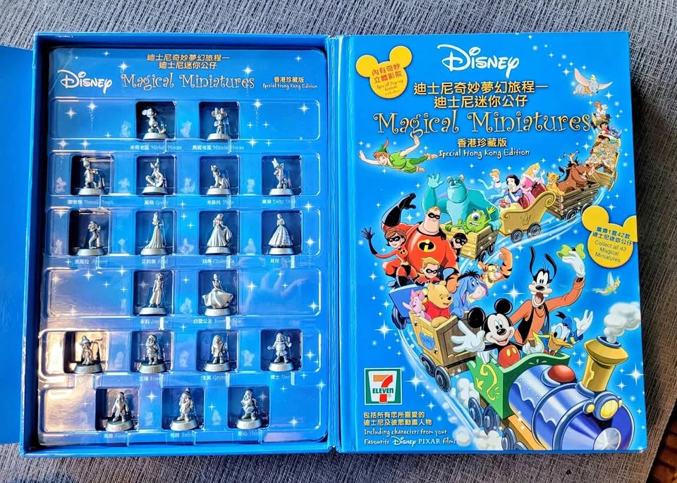 27Disney Magical Miniatures Special Hong Kong Edition, exclusively released in 2005 through 7-Eleven stores in Hong Kong to celebrate the opening of Hong Kong Disneyland. This rare set features a stunning collection of 42 meticulously crafted silver miniature figures, capturing iconic characters from classic Disney and Pixar films—including Mickey Mouse, Minnie Mouse, Donald Duck, Goofy, Snow White, Cinderella, Peter Pan, Winnie the Pooh, Dumbo, The Incredibles, and many more. The set comes in its original pop-up book-style storage case, designed like a magical cinema that showcases the figures in themed scenes. All 42 figures are present and accounted for, in excellent condition with no missing pieces or damage. Each figurine measures approximately 1-3 cm (0.4-1.2 inches) tall, making them ideal for display or play. The box itself measures about 30 cm x 22 cm x 7 cm (11.8 x 8.7 x 2.8 inches) and shows some minor wear from age and storage, but remains intact and structurally sound—overall, the set is in GREAT condition. Pick up only.