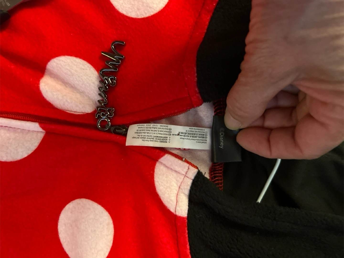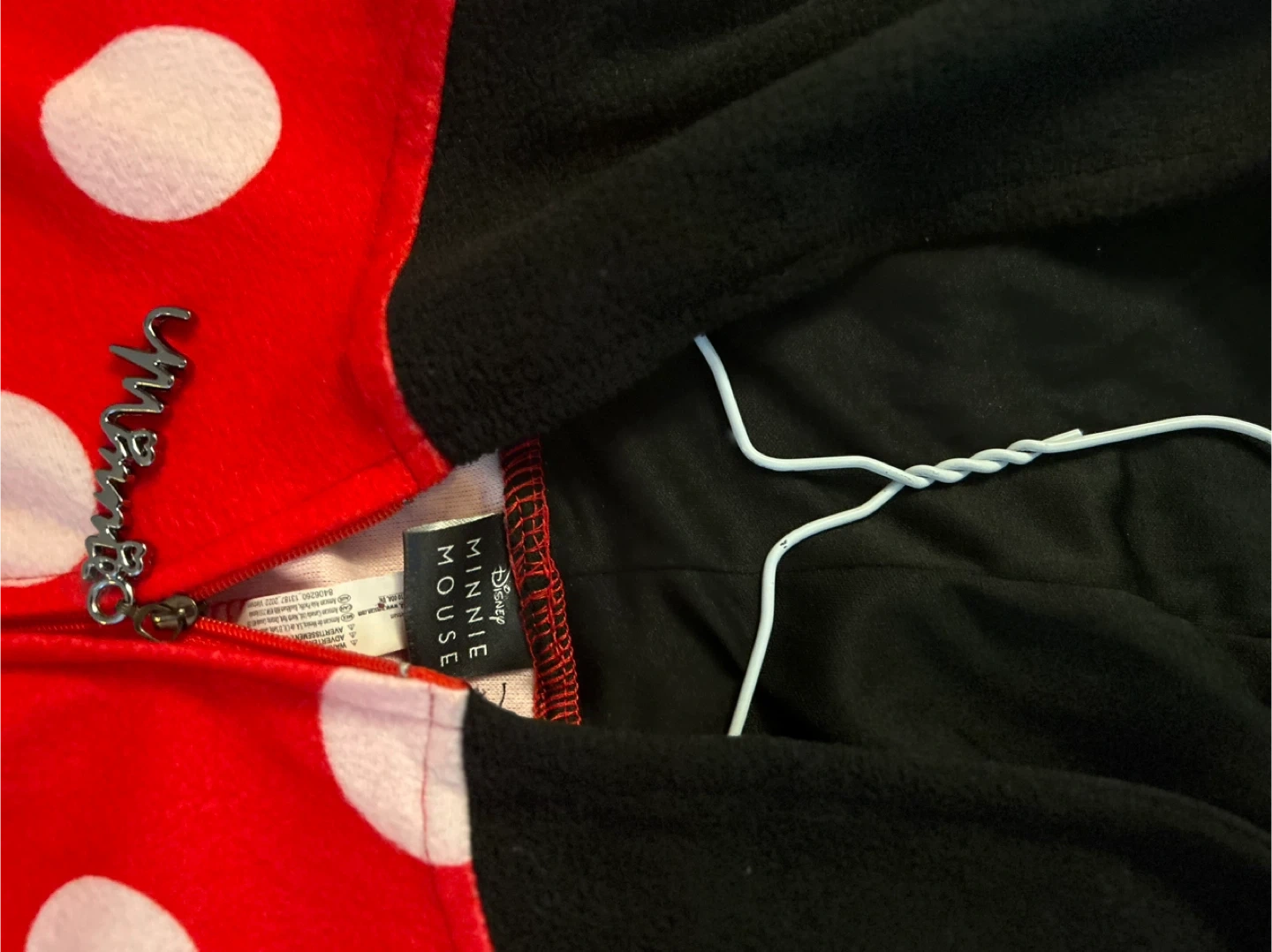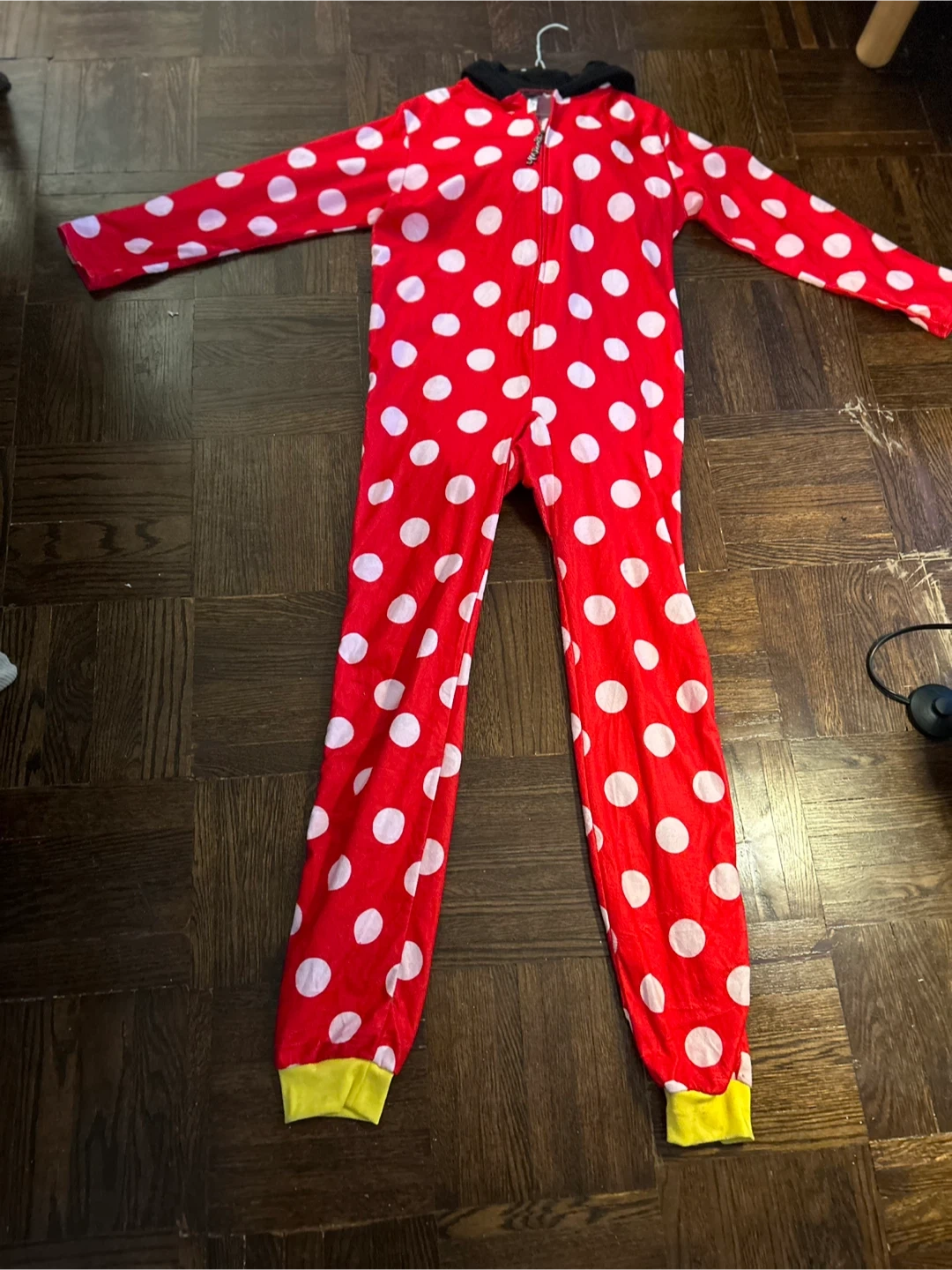 Super cute Minnie Mouse onesie! It's red with white polka dots and has a black hood and ears. Perfect for lounging around the house or a fun costume