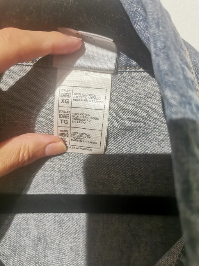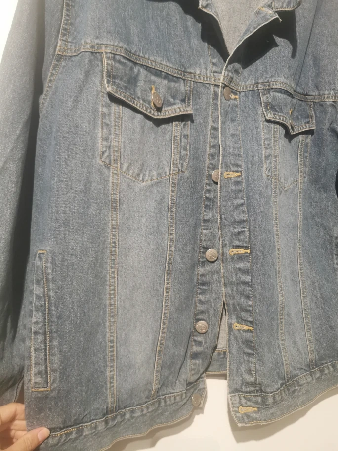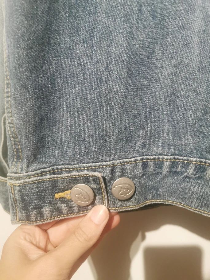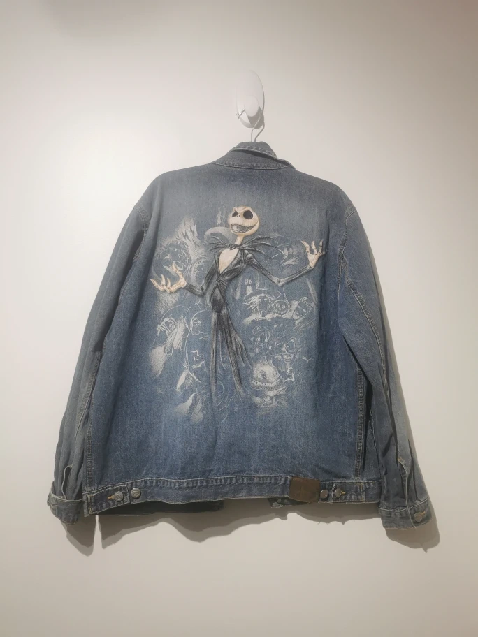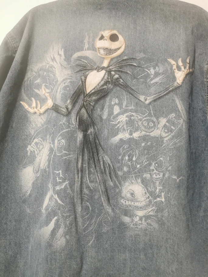 Selling a Disney denim jacket featuring Jack Skellington from The Nightmare Before Christmas. It's a light blue denim wash with a large graphic on the back. The buttons and a leather patch also have the Disney logo on them. A fun piece for any Disney fan!