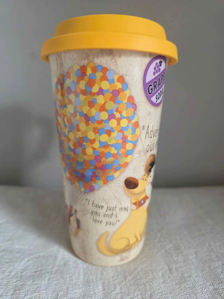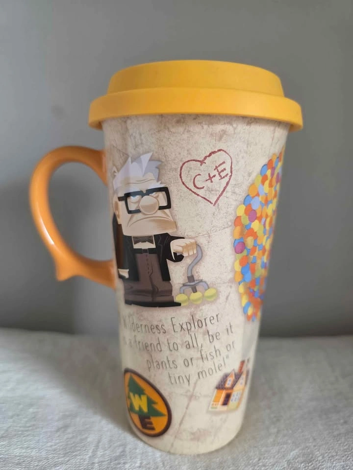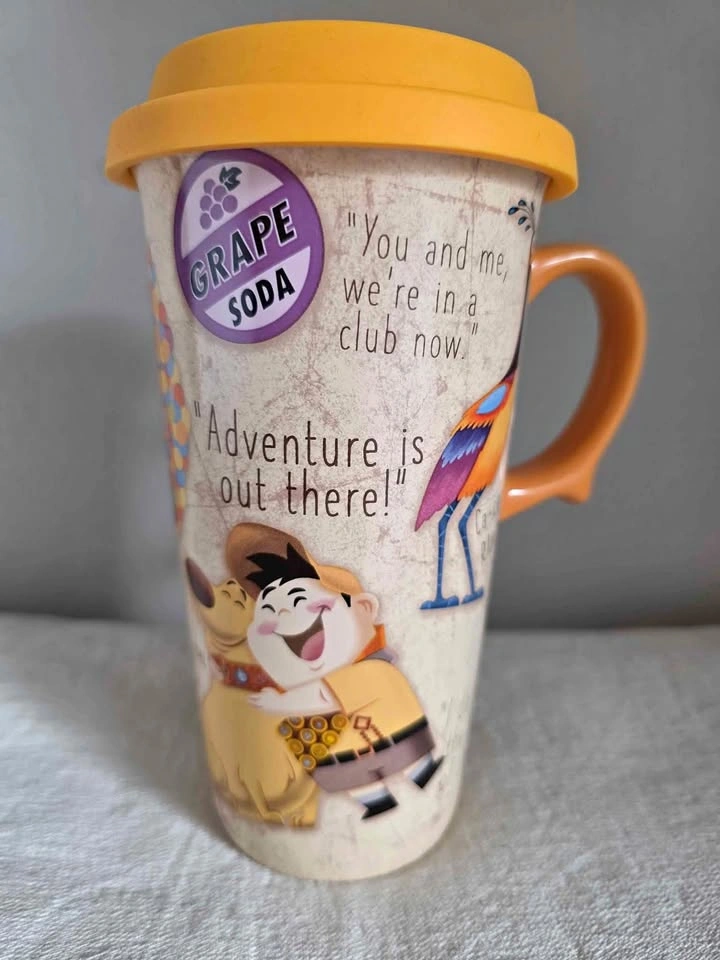65Celebrate adventure with this charming Disney/Pixar Up travel mug, featuring beloved characters Carl, Ellie, Russell, and Dug from the heartwarming Pixar film. This officially licensed Disney Parks mug captures all the joy and nostalgia of the movie — complete with the iconic Grape Soda badge and memorable quotes like “Adventure is out there!” ☕ Item Details Brand: Disney / Pixar Design: Up – featuring Carl, Ellie, Russell, Dug, and the house with balloons Material: Ceramic mug with removable silicone lid Color: Beige exterior with multicolor graphics; orange interior and yellow lid Capacity: Approx. 12–14 oz Markings: ©Disney/Pixar – Made in Thailand (see bottom stamp) Condition: Like new. Preowned Condition – Clean inside and out, no noticeable wear, no chips or cracks. 🎈 Features Detailed wraparound artwork inspired by Disney/Pixar’s Up Includes Grape Soda Club emblem and classic movie quotes Dishwasher and microwave safe (hand washing recommended for longer life) Great collectible for Pixar fans or Disney mug collectors