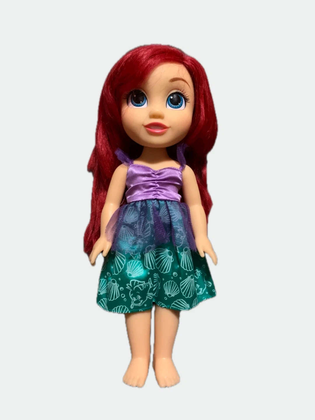 1000+This is a cute Ariel toddler doll from Disney Princess! She has beautiful red hair and is wearing a dress with seashell patterns. Perfect for any little fan of The Little Mermaid!