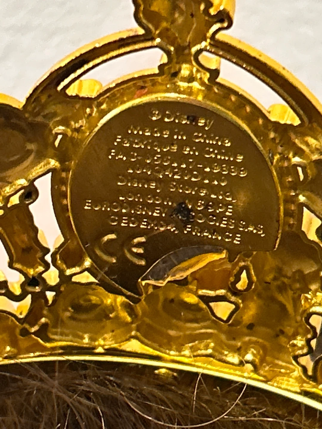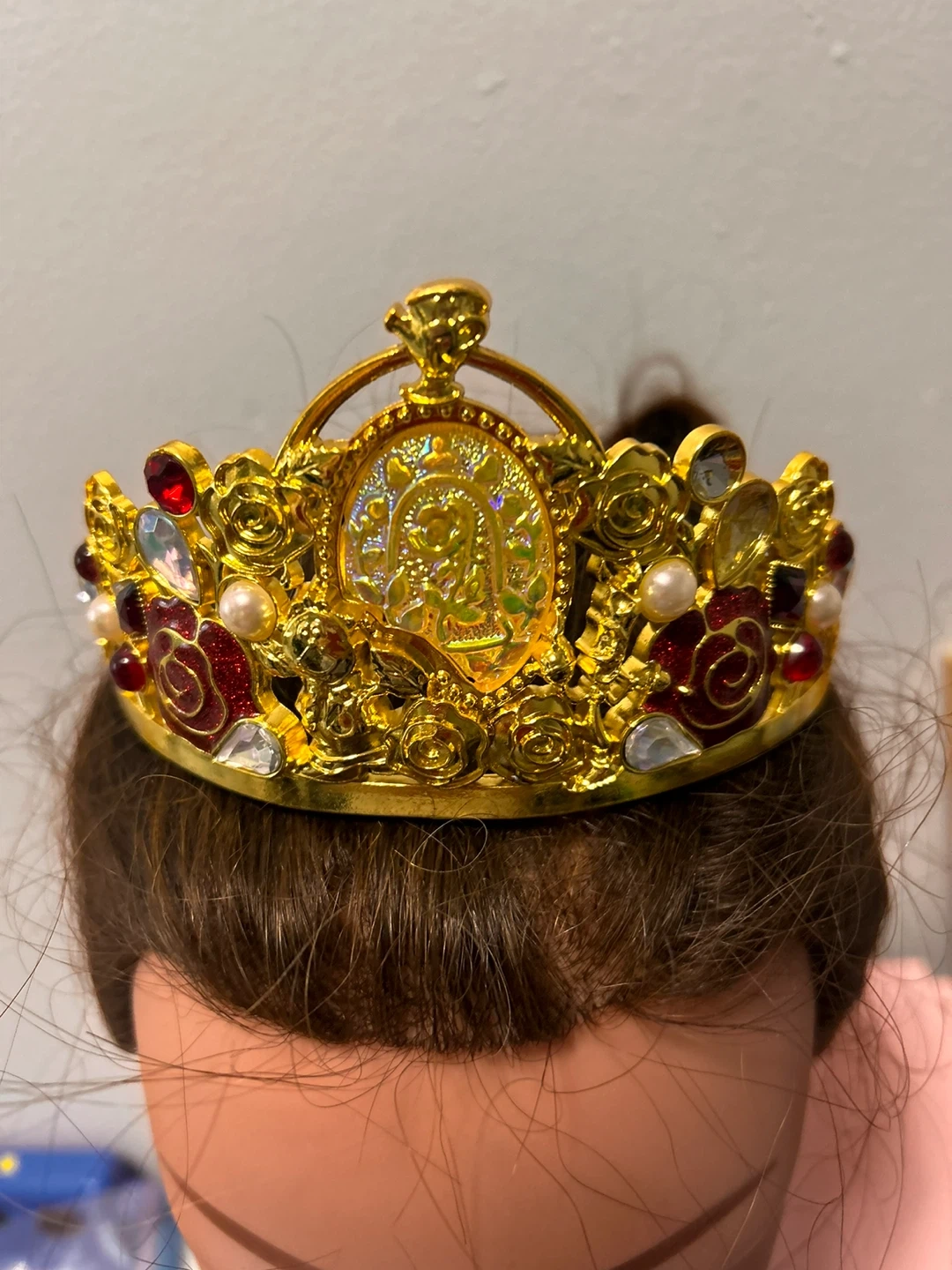 A beautiful golden tiara inspired by Disney's Princess Belle! It's adorned with faux pearls, red and clear gems, and intricate rose designs. Perfect for dress-up or a Disney collector